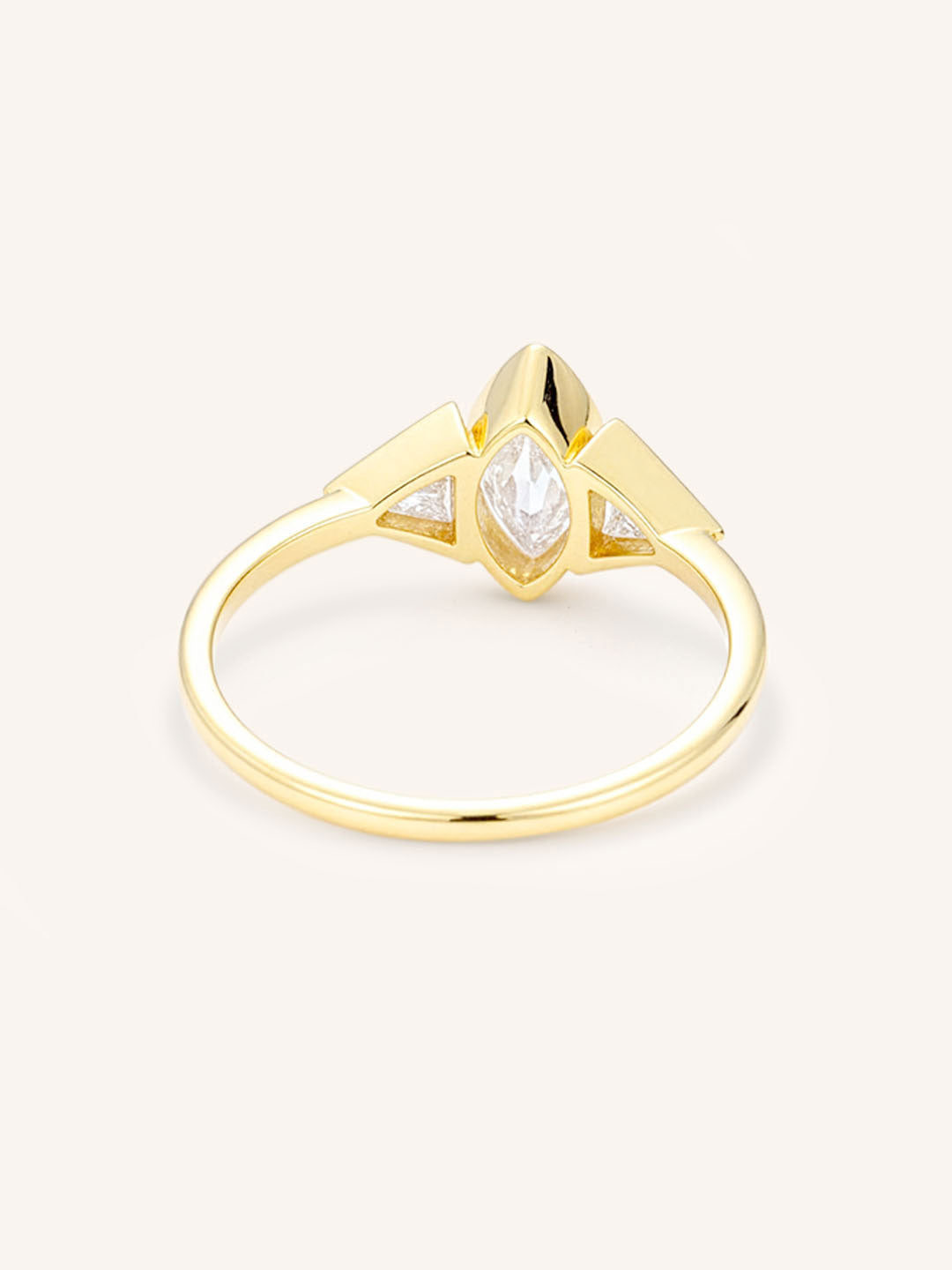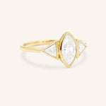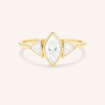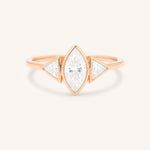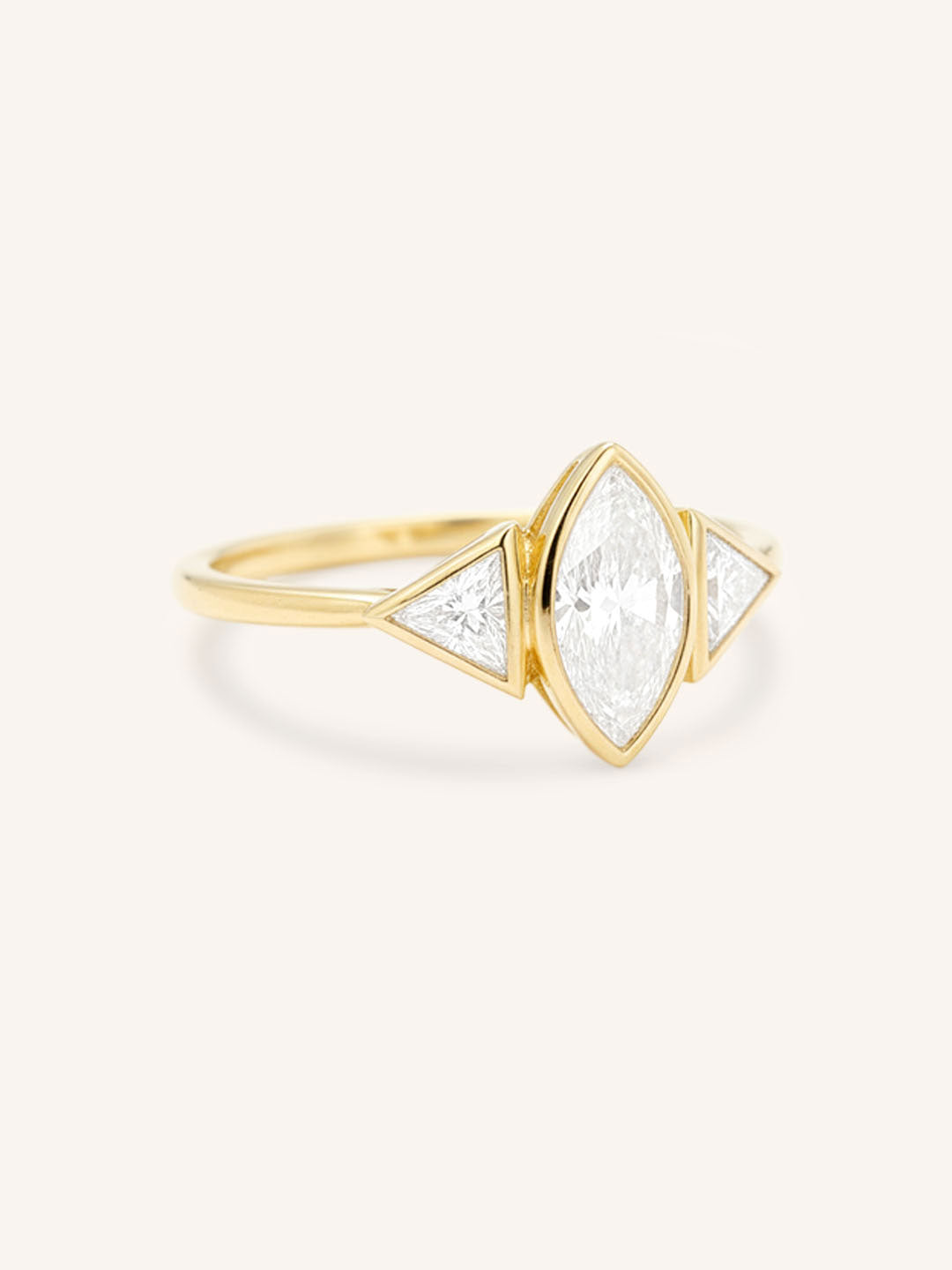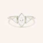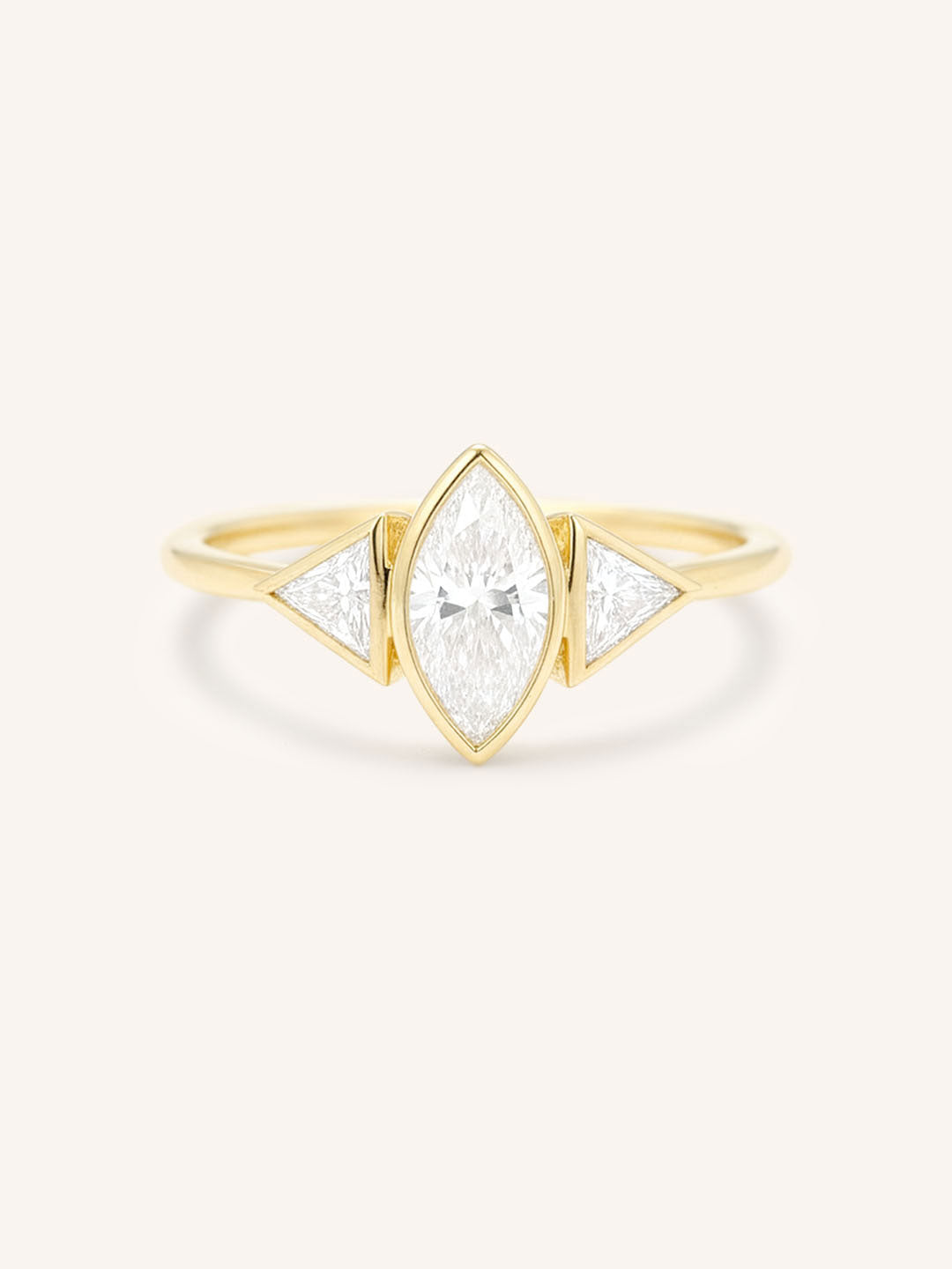 The Caldwell Three Stone Bezel Marquise and Triangle Diamond Engagement Ring features a striking marquise center diamond framed by two sleek triangle side stones. Each stone is securely bezel set, creating a bold yet balanced silhouette that blends modern artistry with timeless elegance.