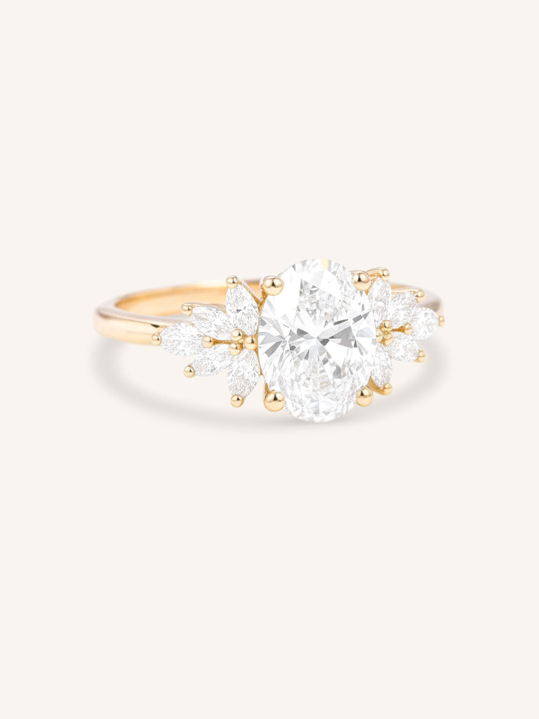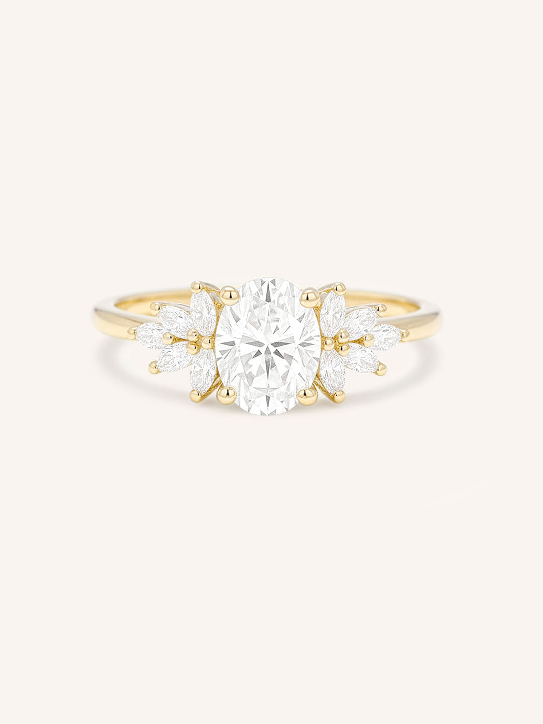 Discover a classic engagement ring with a modern twist. This stunning ring features a brilliant oval diamond at the center, set in a cluster style with marquise diamonds adorning each side. The cluster design of this ring is both timeless and contemporary, making it a perfect choice for any bride.