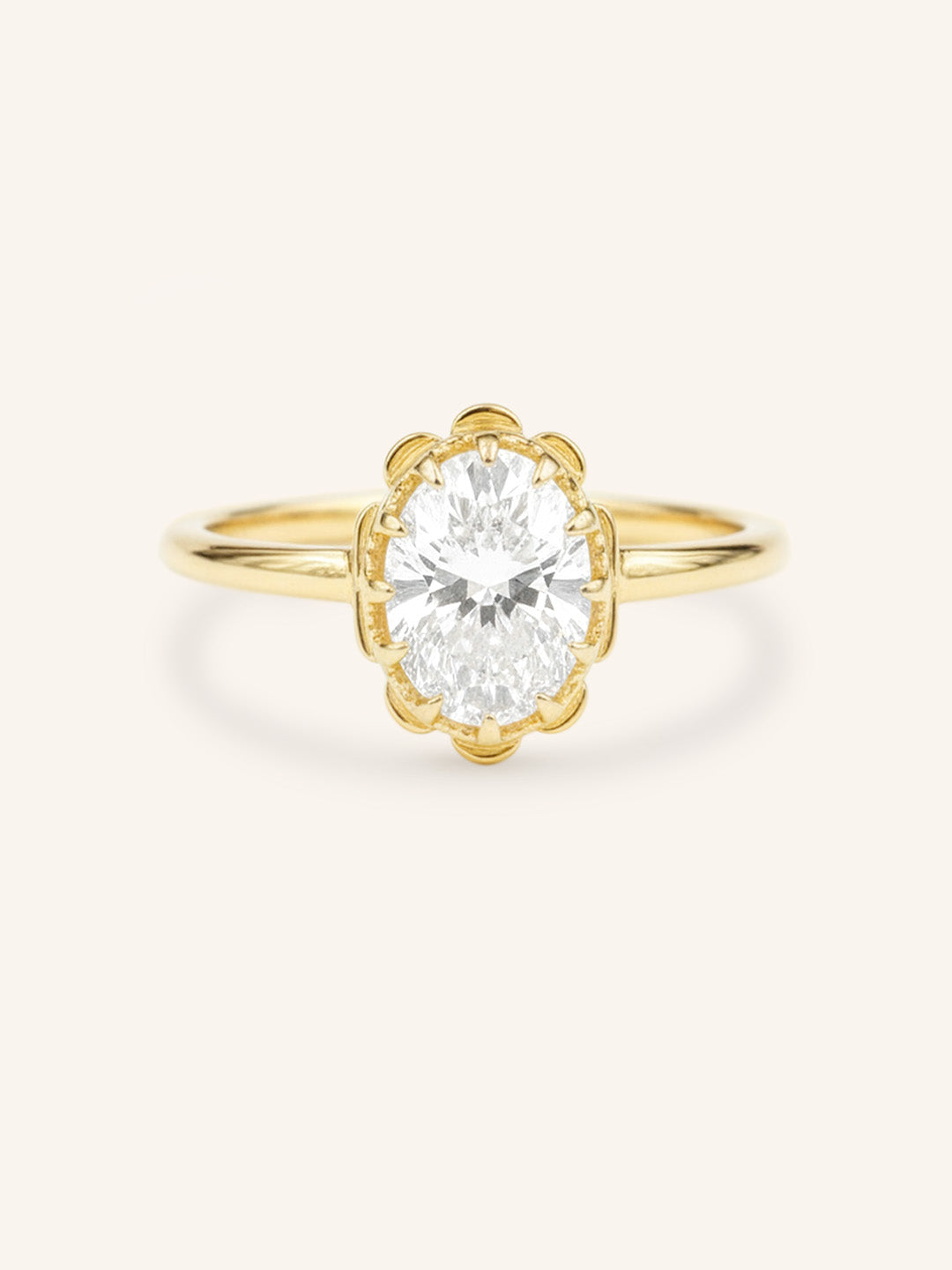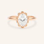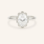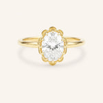 The Jenner Oval Diamond Solitaire Engagement Ring is a vintage-inspired treasure, featuring an elegant scalloped design and a low-profile setting for everyday comfort. At its center, a brilliant oval diamond is secured with multiple prongs, highlighting its radiance while adding intricate detail. Perfect for those who value timeless charm and practical elegance, the Jenner ring is a stunning symbol of love and commitment.