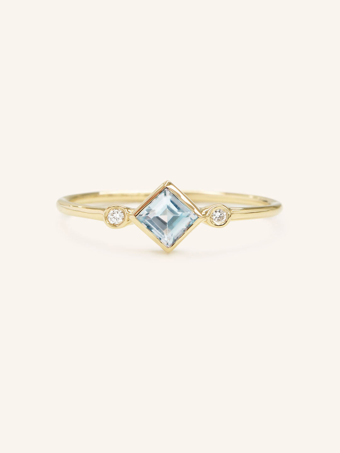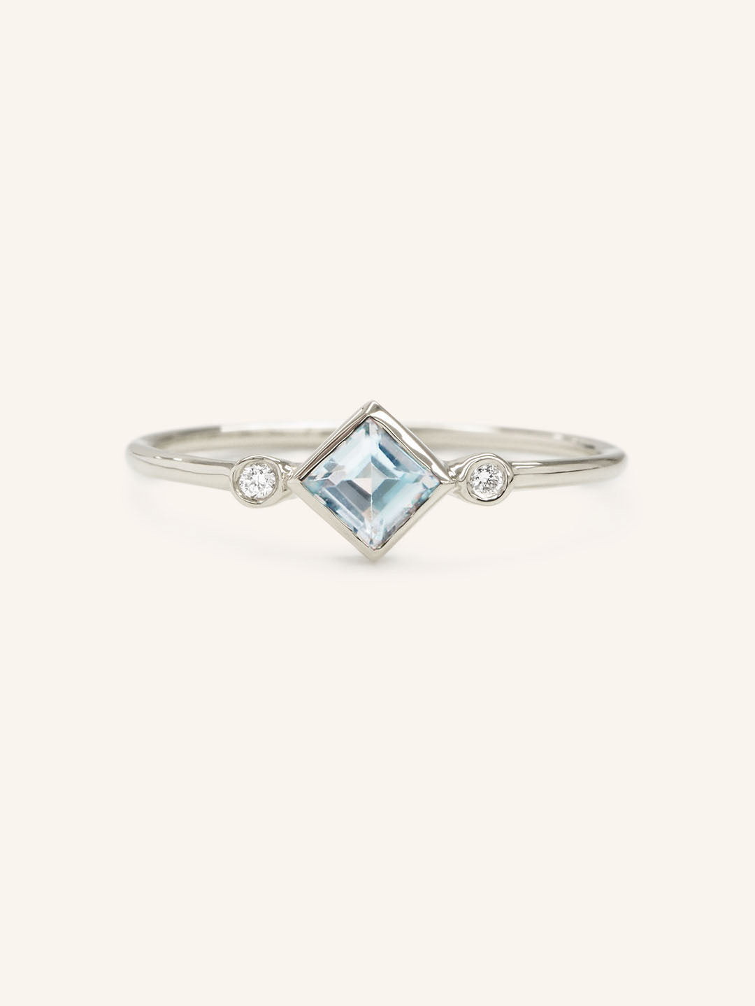 Wildflowers represent a joy that is colored in the most amazing hues. The Wildflower ring emulates this happiness with a petite ring you can stack or wear alone. It features a minimal princess cut gemstone bezel-set diagonally embellished by two luminous diamonds to make the rich colors of the ring blossom.