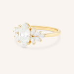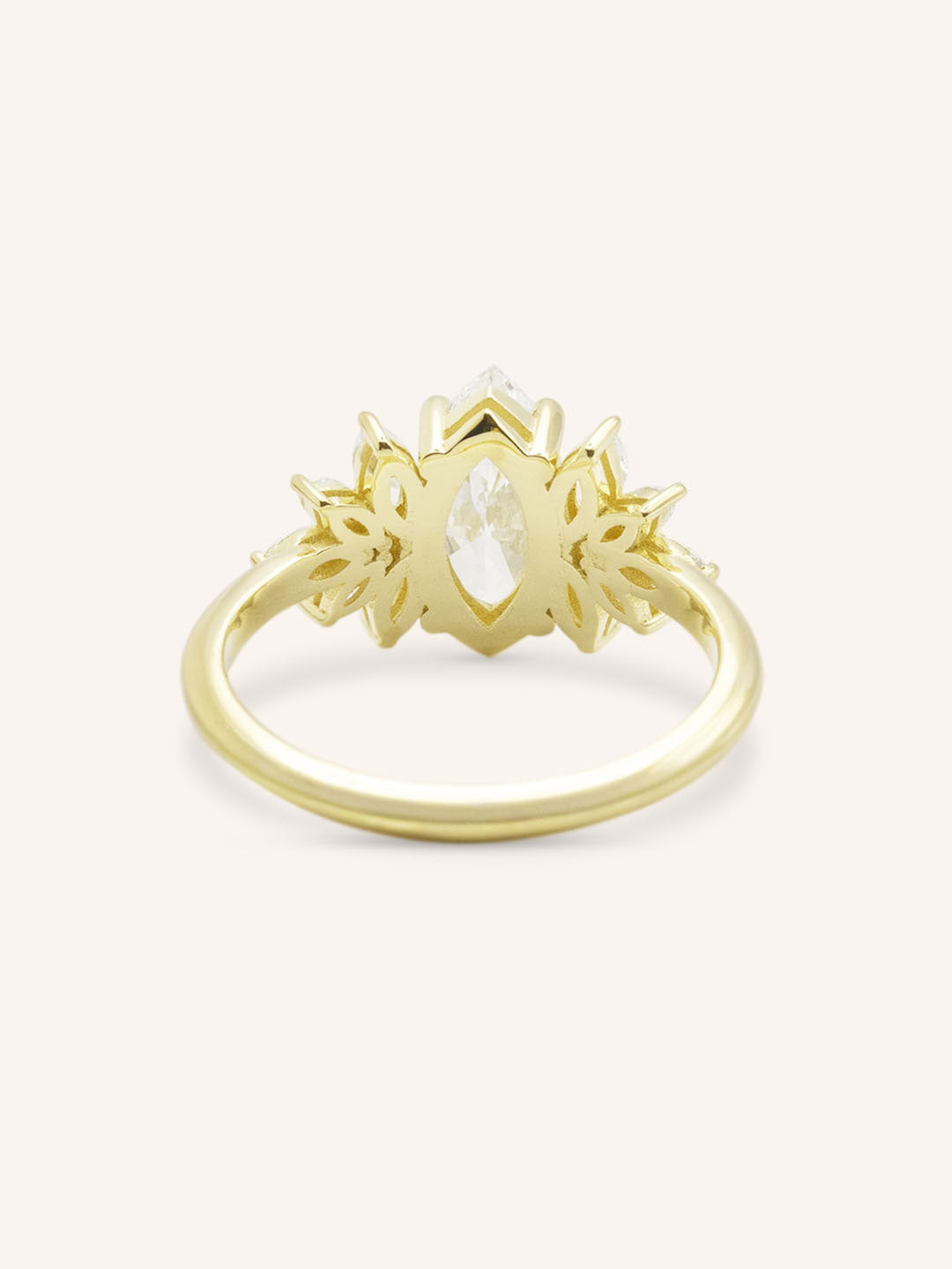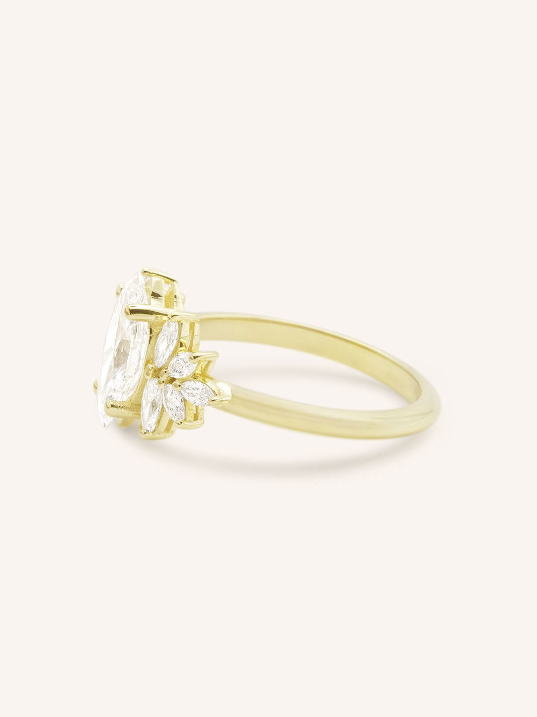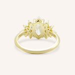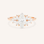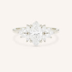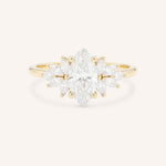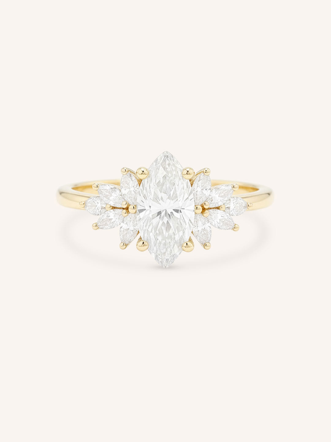 Discover a classic engagement ring with a modern twist. This stunning ring features a brilliant moissanite marquise at the center, set in a cluster style with marquise moissanites adorning each side. The cluster design of this ring is both timeless and contemporary, making it a perfect choice for any bride.
