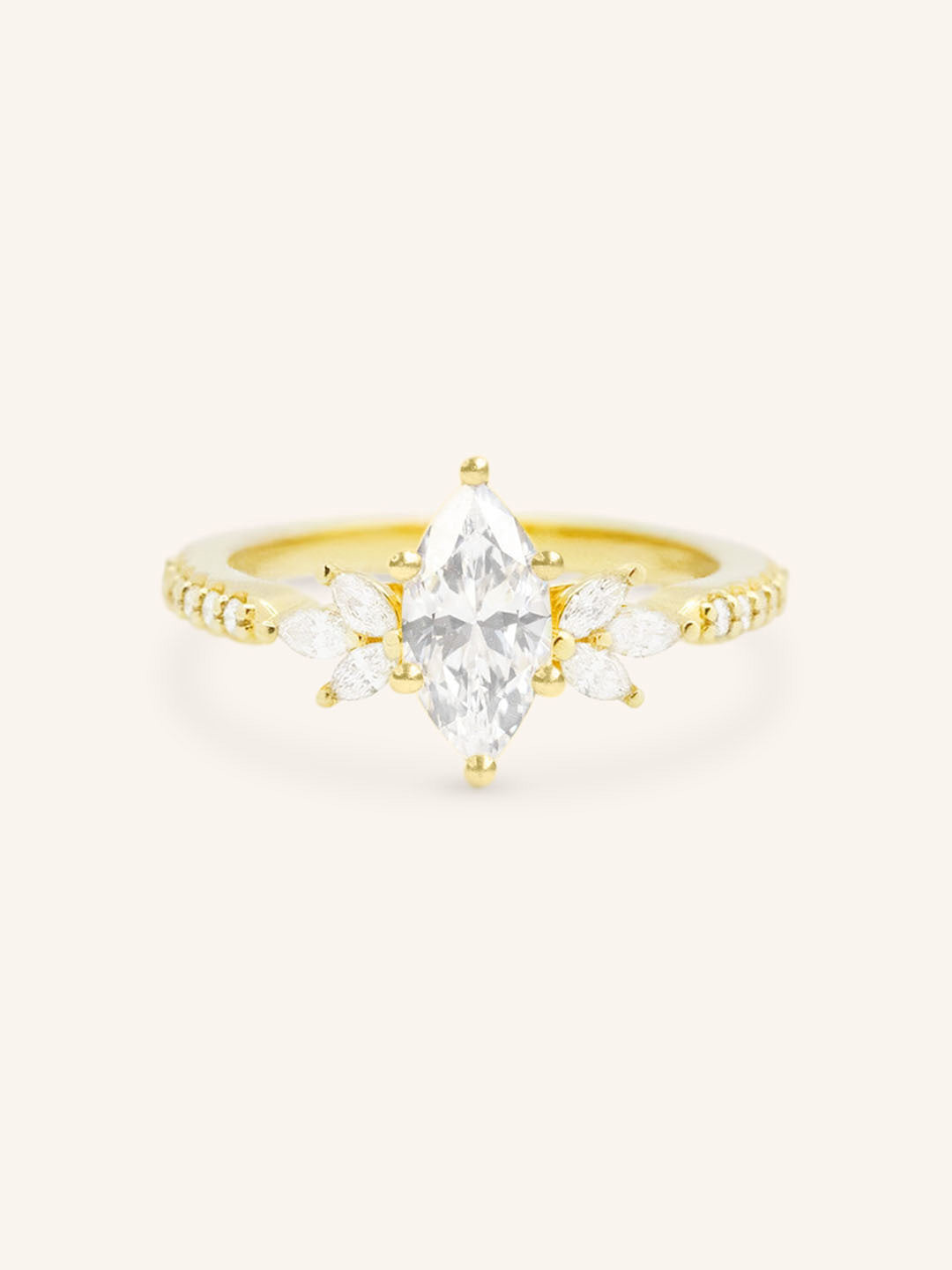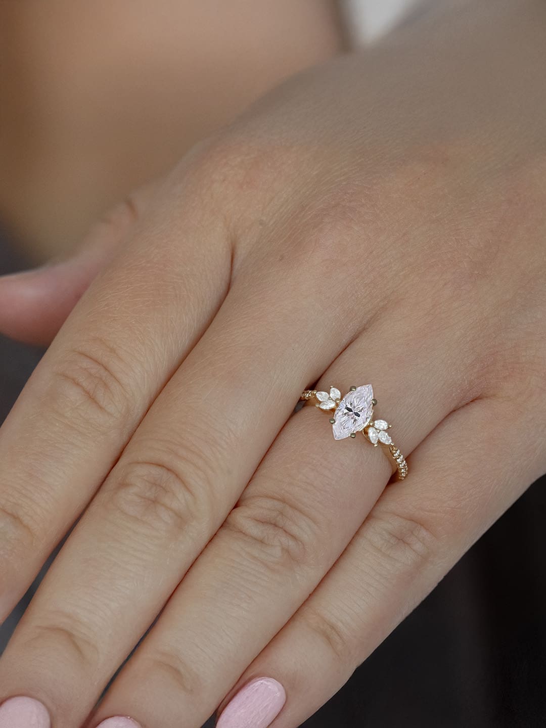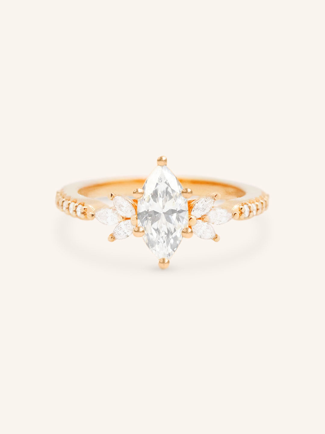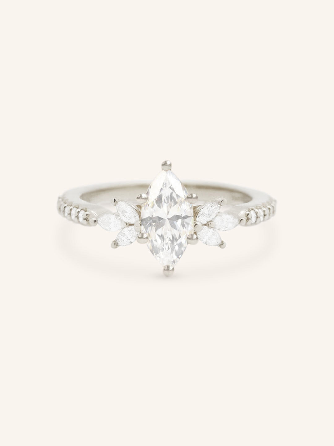 The Melina Dee Diamond Engagement Ring is a masterpiece of natural beauty. Marquise diamonds bloom outward from the center stone, evoking the grace of petals, while accent diamonds line the band for added brilliance. This distinctive design captures elegance and romance, making it a perfect symbol of your love story.