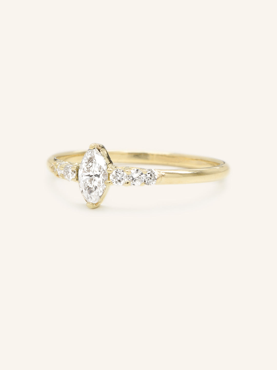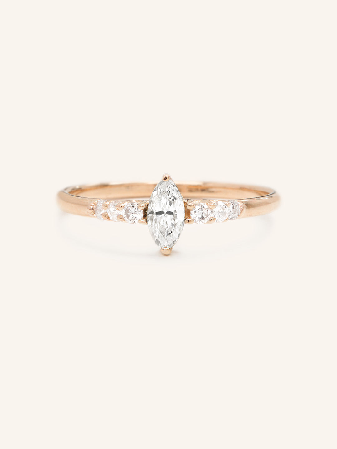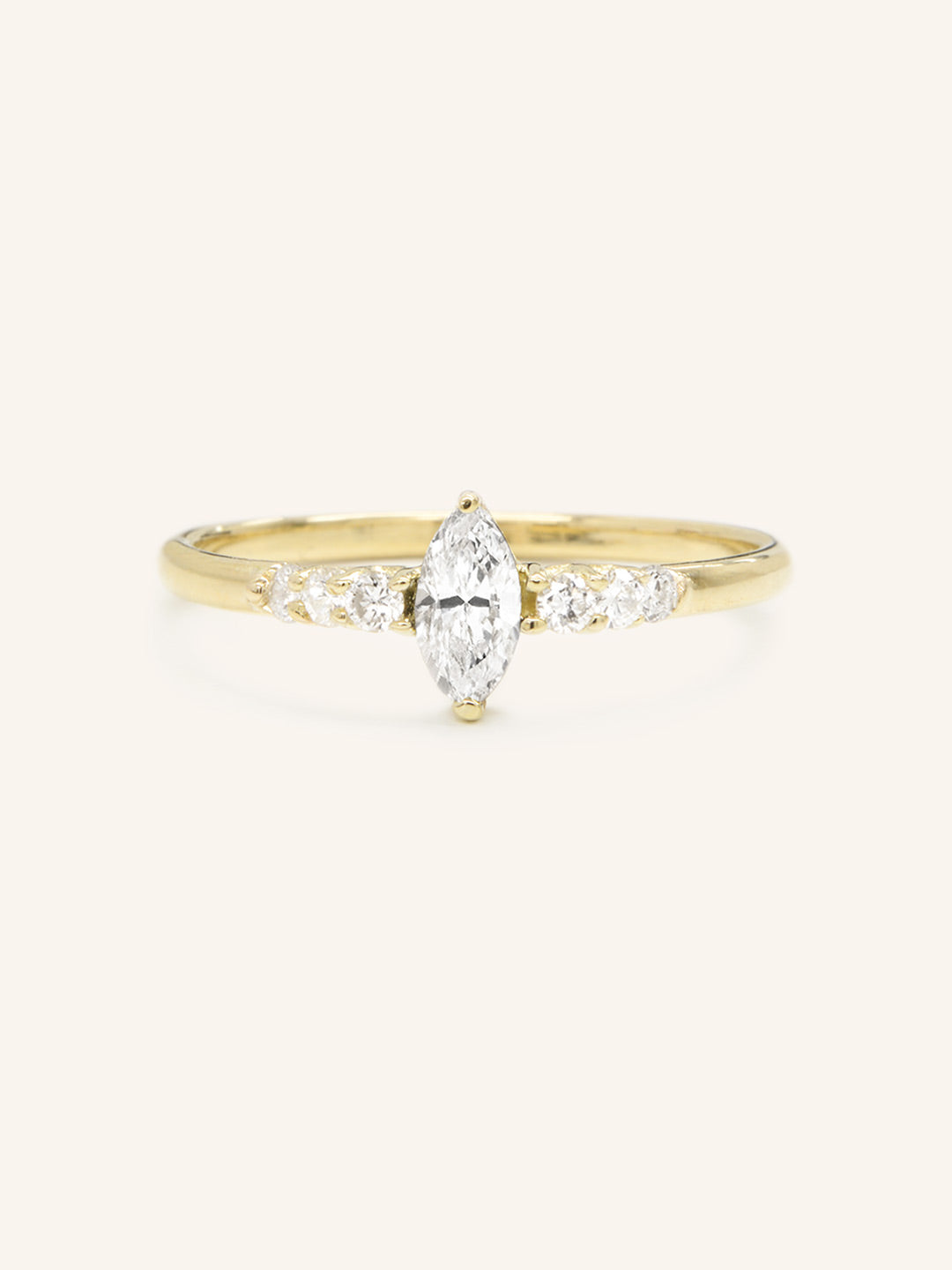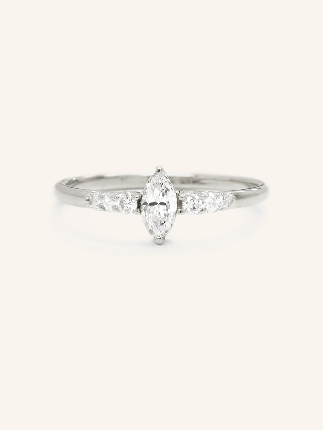 A magnificent bright white marquise-shaped moissanite ring represents the moonlight shining in the night sky. The addition of six shimmering accent diamonds completes this starry picture and illuminates this classic piece.