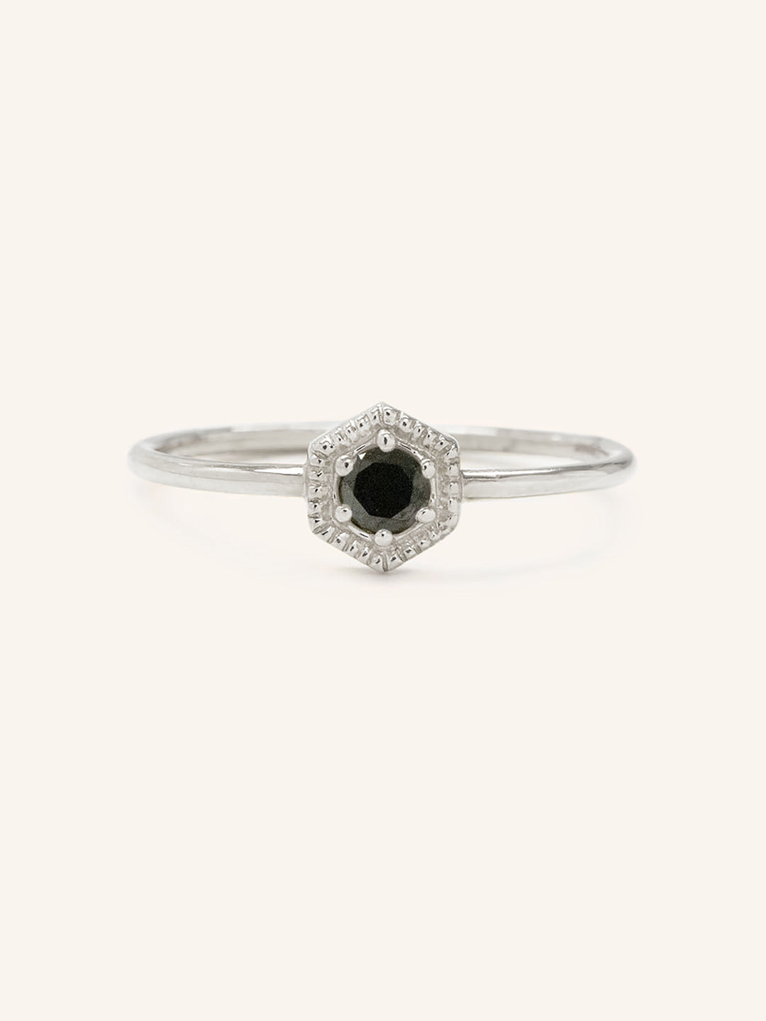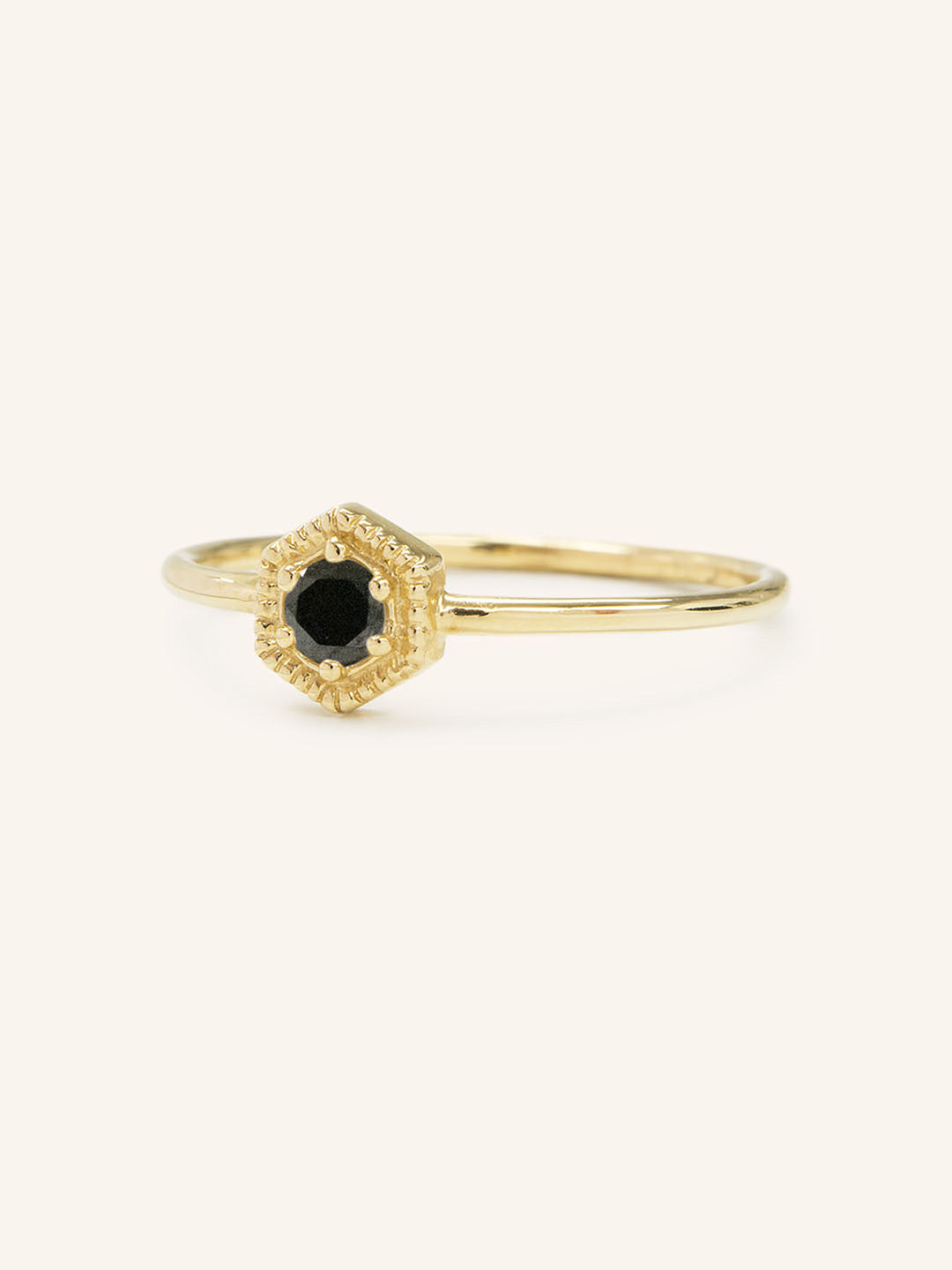 The Marigold Ring is a beautiful hexagon shape six prong setting with a single brilliant black diamond, with delicate hand beading around the edge -what a fun geometric addition to your collection.