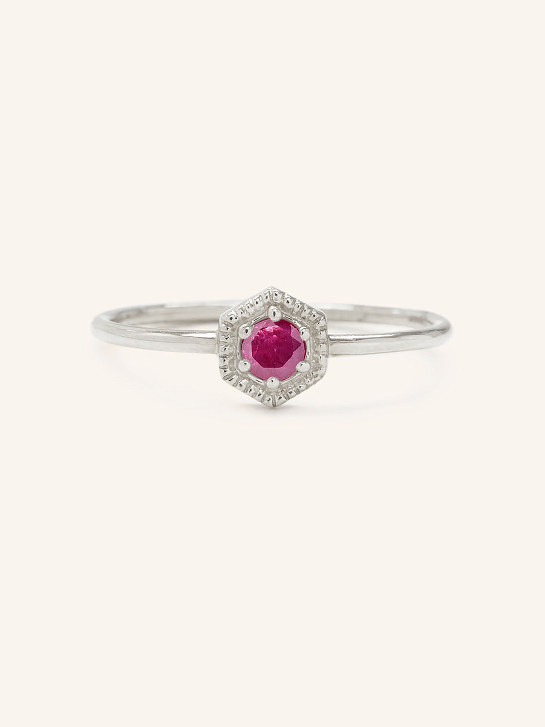 The Marigold Ring is a beautiful hexagon shape six prong setting with a single brilliant ruby, with delicate hand beading around the edge -what a fun geometric addition to your collection.