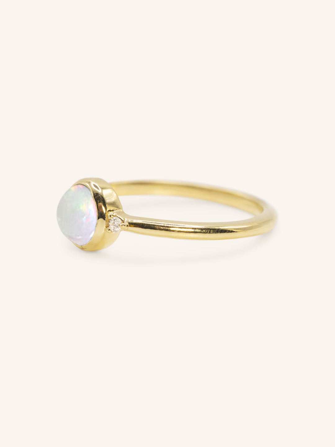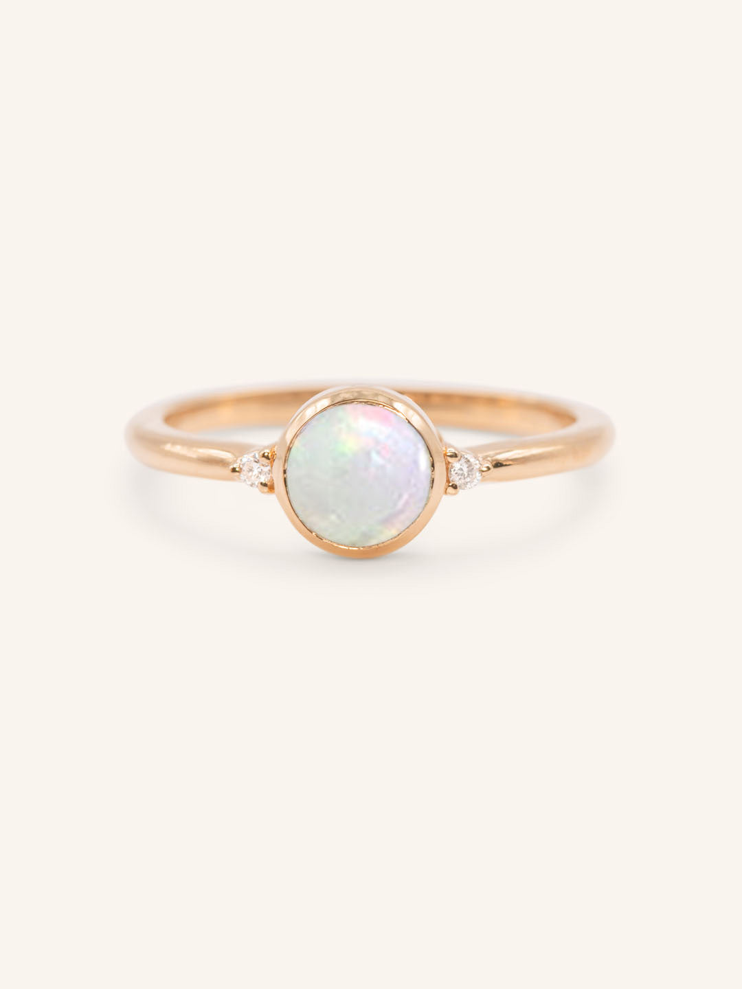 The Templa Cabochon Opal Diamond Ring captures attention with a luminous cabochon opal at its center, framed by sparkling diamonds that enhance its natural beauty. Set in 14k gold, this ring radiates an ethereal charm, with the opal’s shifting colors creating a mesmerizing effect. Perfect as a statement piece or a unique addition to any collection, the Templa ring is a true celebration of elegance and artistry.