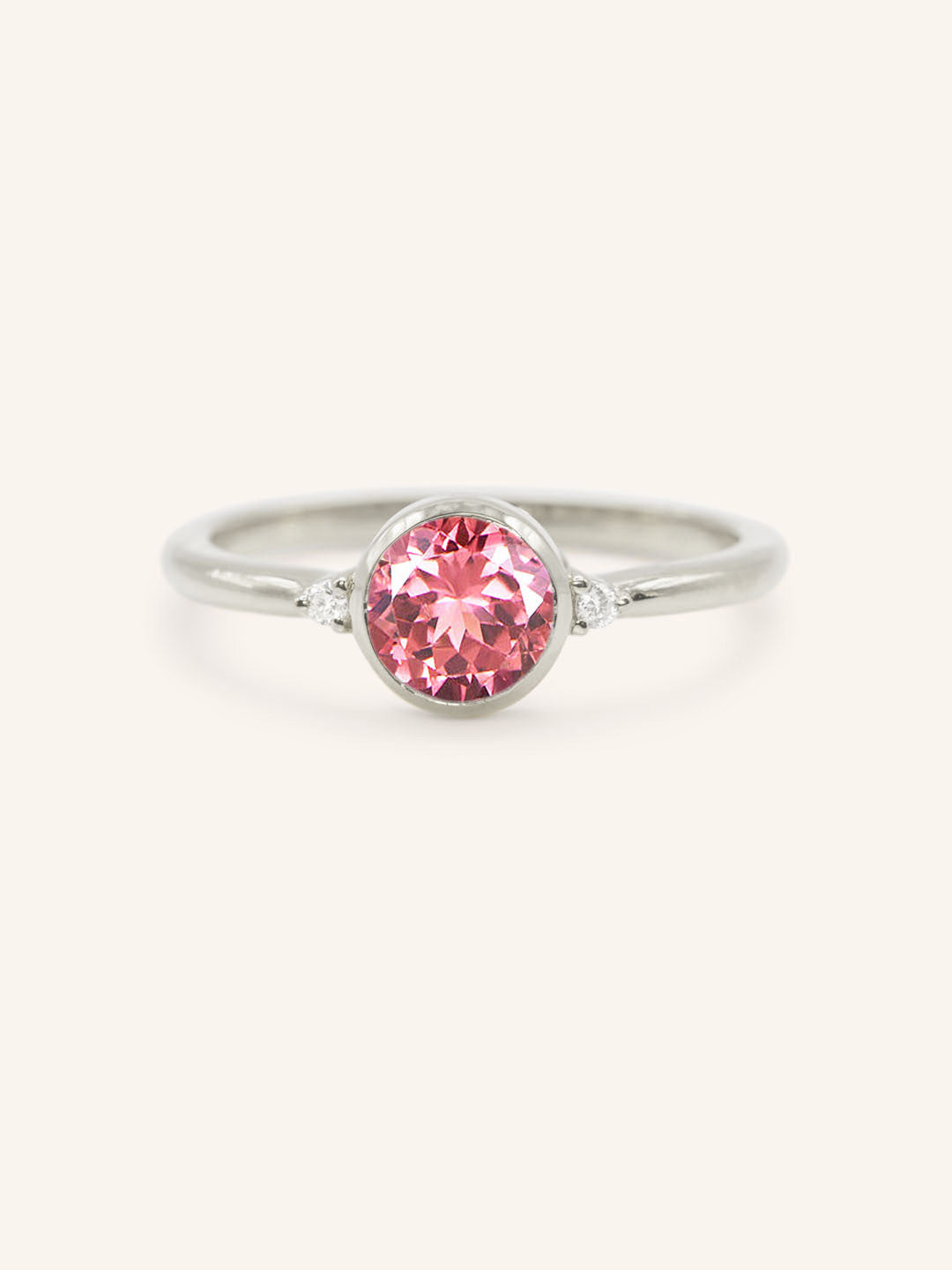 The Templa Ring is a refined three-stone design, perfect for celebrating meaningful moments. A bezel-set center stone, representing a birthstone, is flanked by two dazzling diamonds, creating a balanced and elegant look. This timeless piece is both personal and sophisticated, making it a perfect choice for everyday wear or special occasions.
