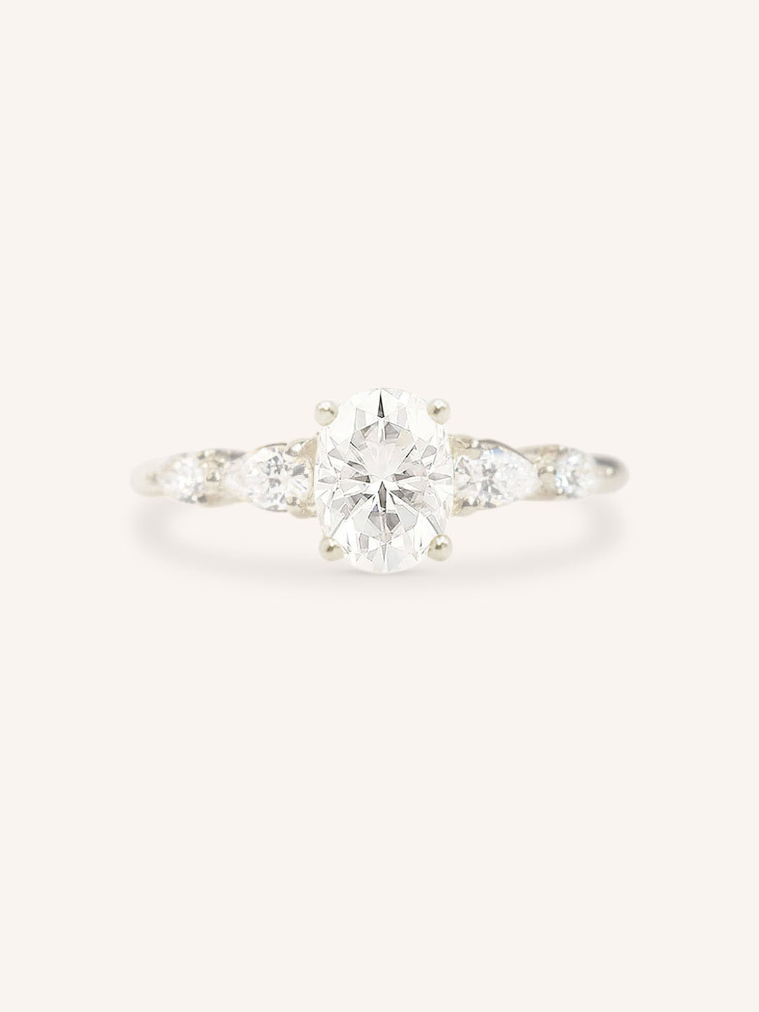 Featuring a oval cut lab-grown diamond, available in 7x5 mm, 8x6 mm, or 9x7 mm sizes. The center stone will come with an IGI report.