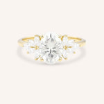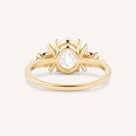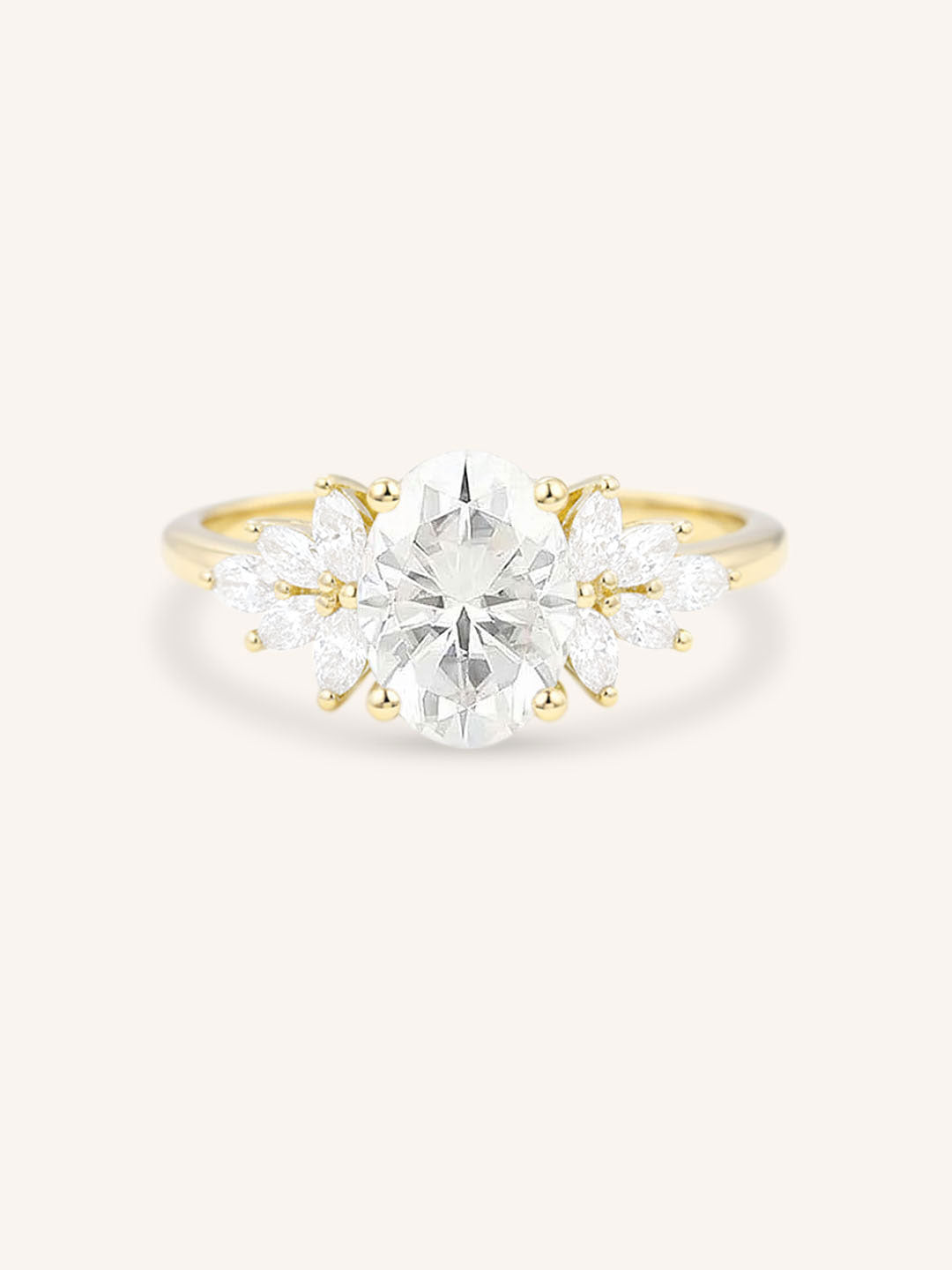 Discover a classic engagement ring with a modern twist. This stunning ring features a brilliant oval diamond at the center, set in a cluster style with marquise diamonds adorning each side. The cluster design of this ring is both timeless and contemporary, making it a perfect choice for any bride.