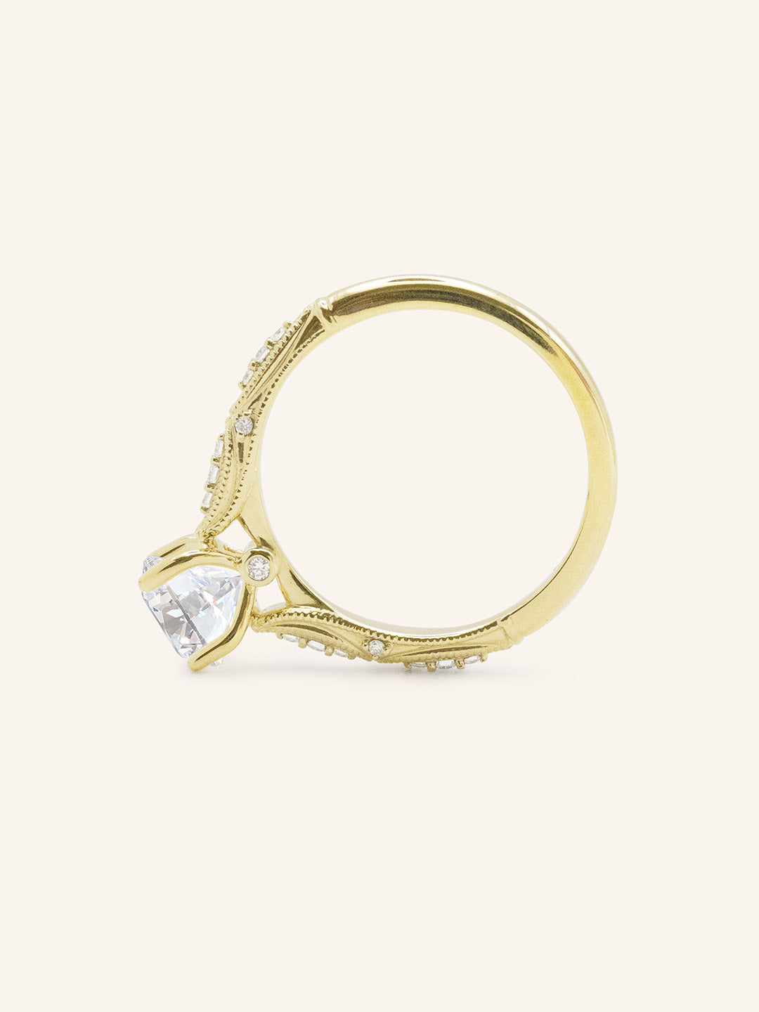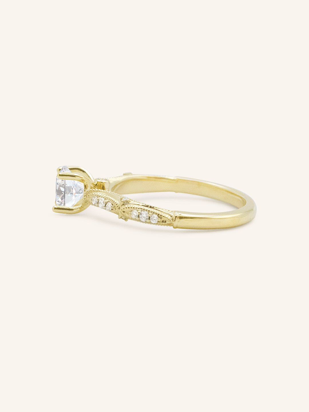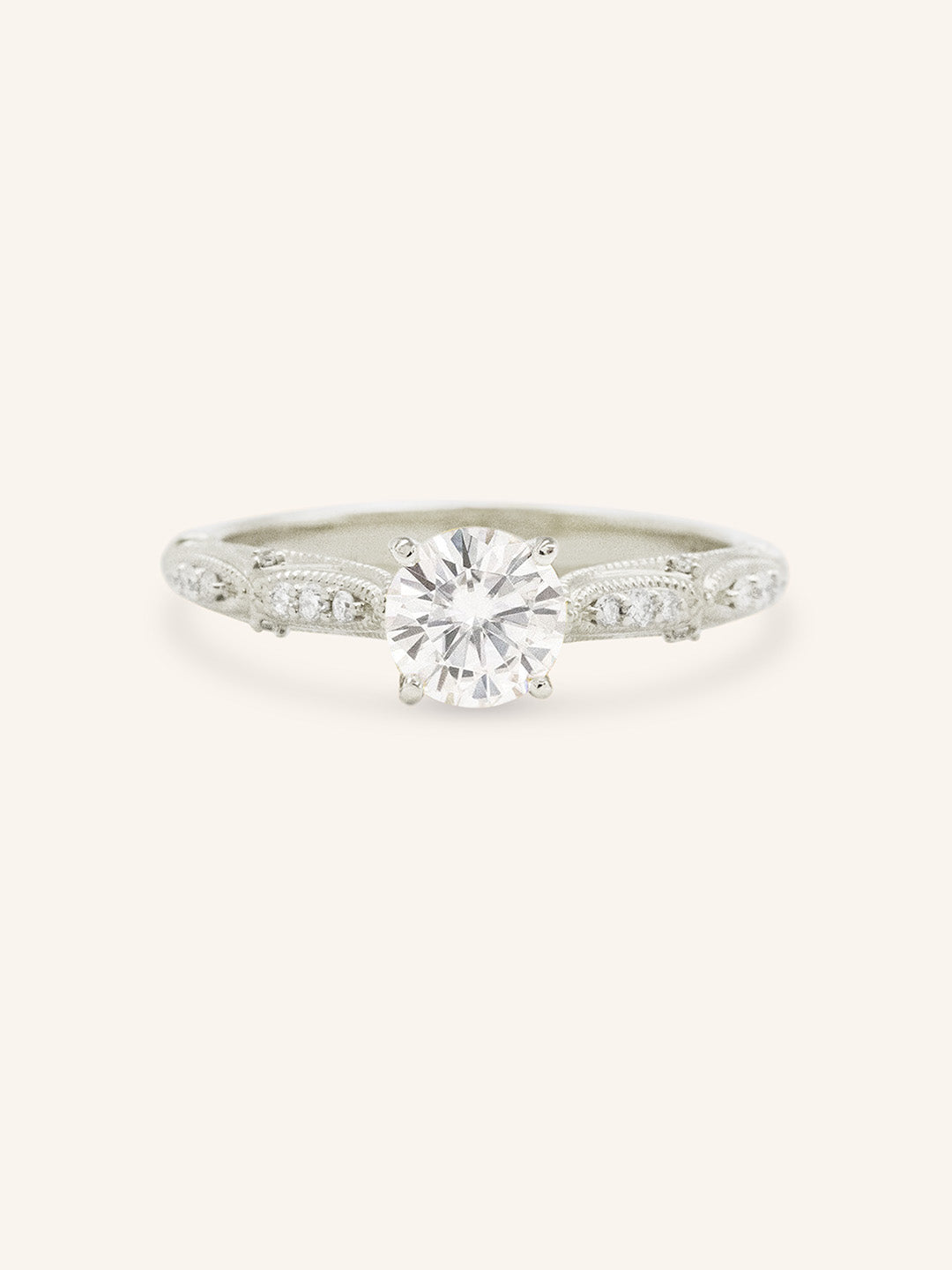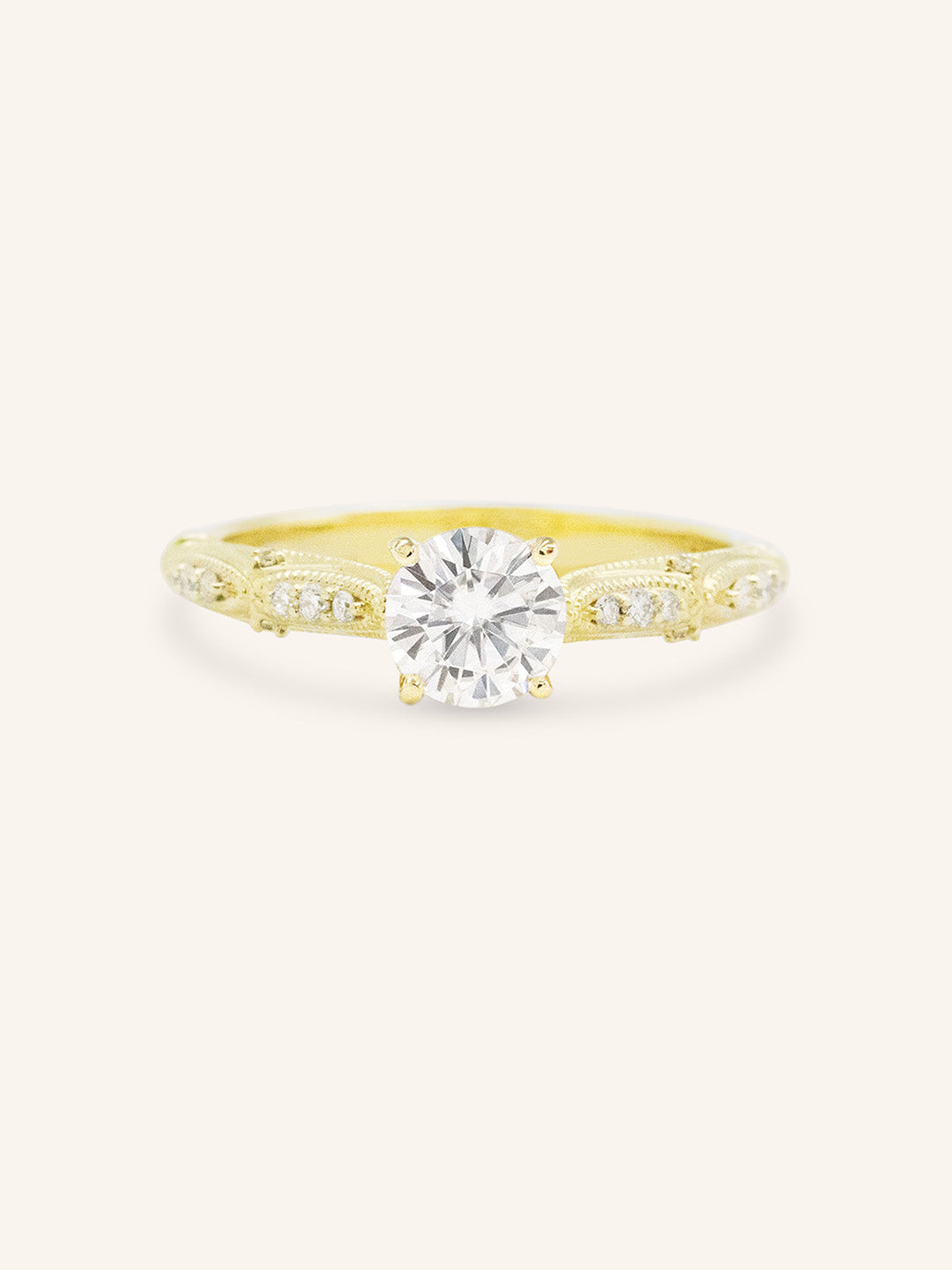 The Esther Ring is a vintage-inspired design featuring a brilliant diamond at its center. Delicate milgrain detailing along the band adds old-world charm, while subtle accent stones enhance its romantic elegance. A timeless piece for those who adore classic craftsmanship with a touch of nostalgia.