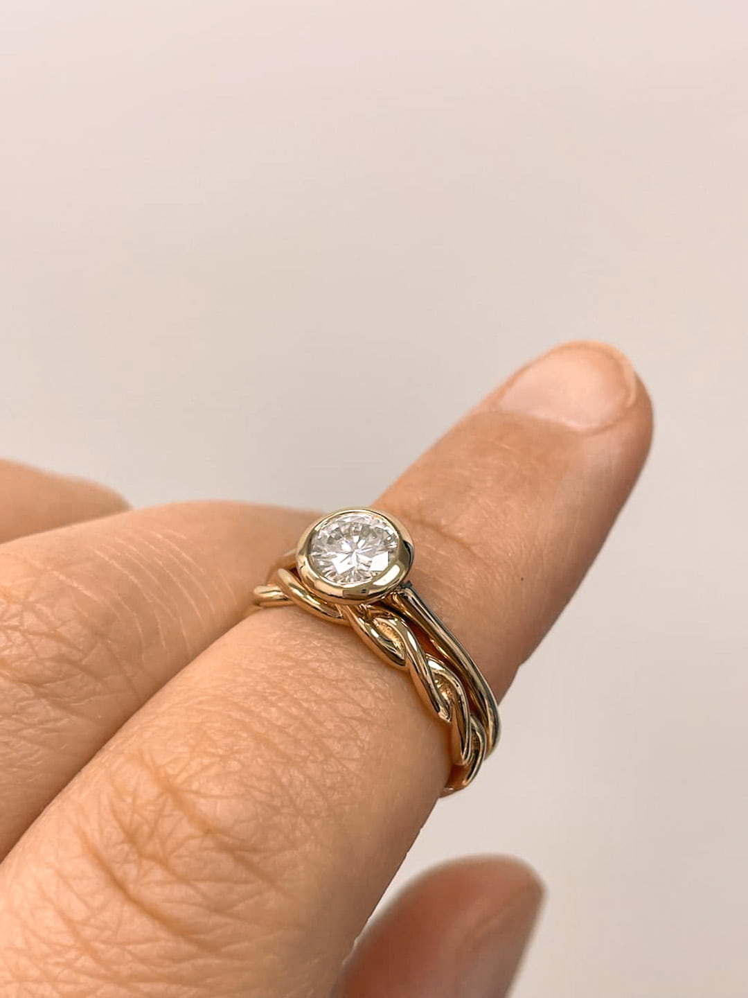 This luxurious moissanite engagement ring is sleek and classic with the soft lines of the bezel encapsulating a stunning round brilliant moissanite. This ring features a subtle low profile cathedral to allow different types of wedding bands to fit underneath the setting.