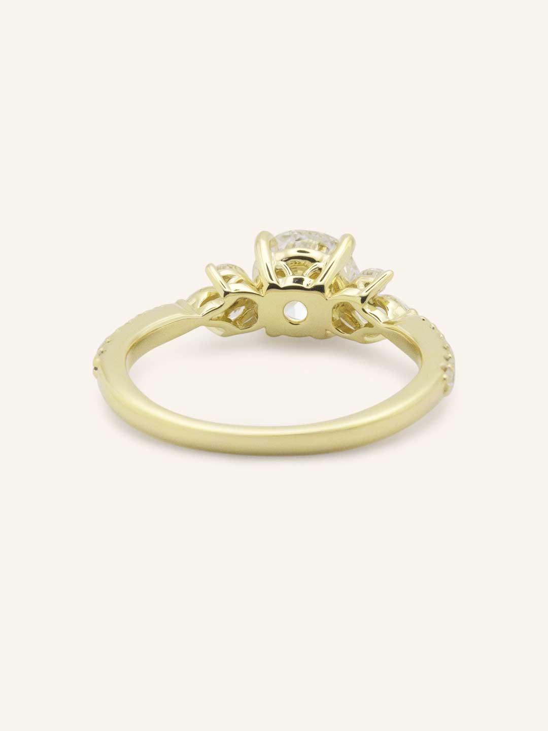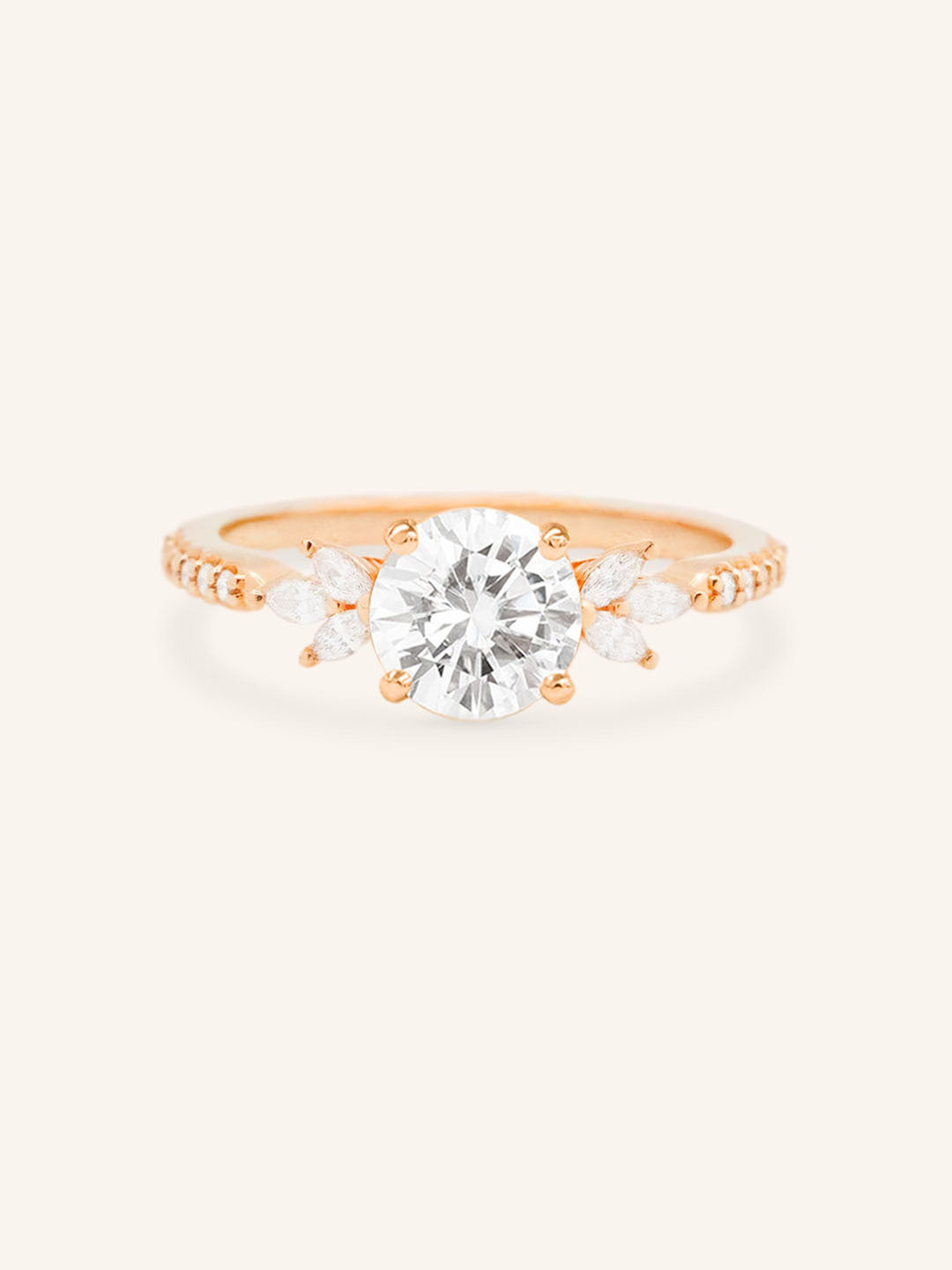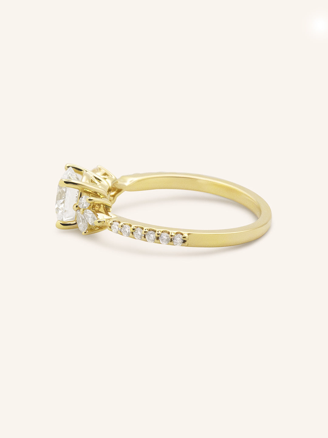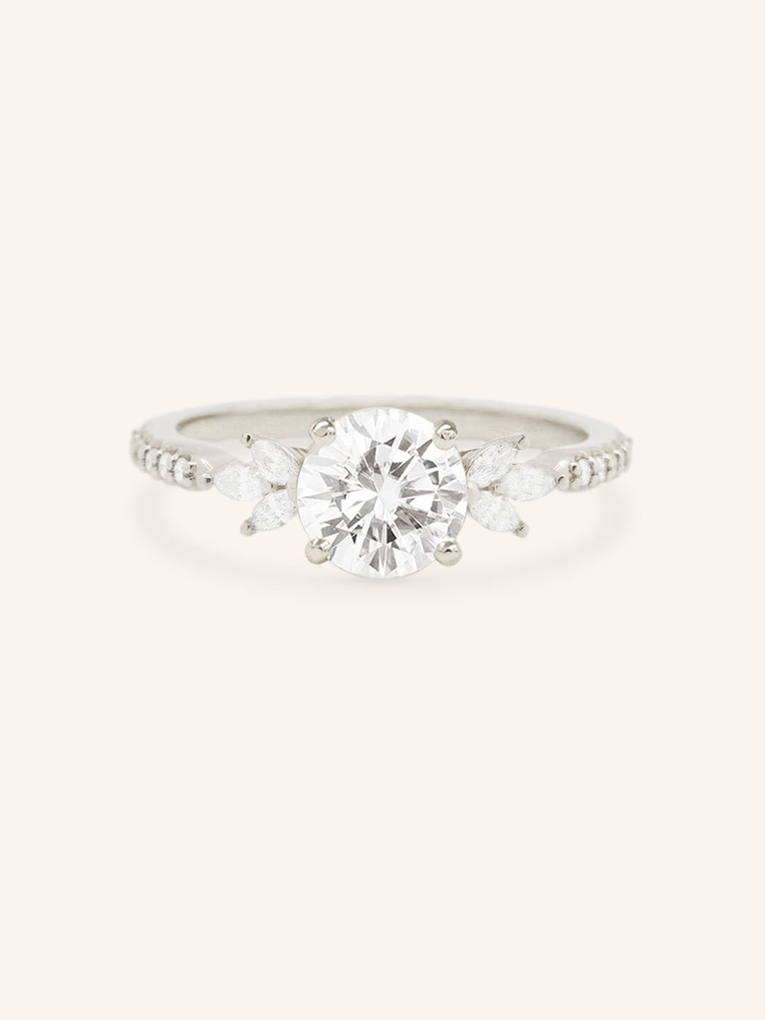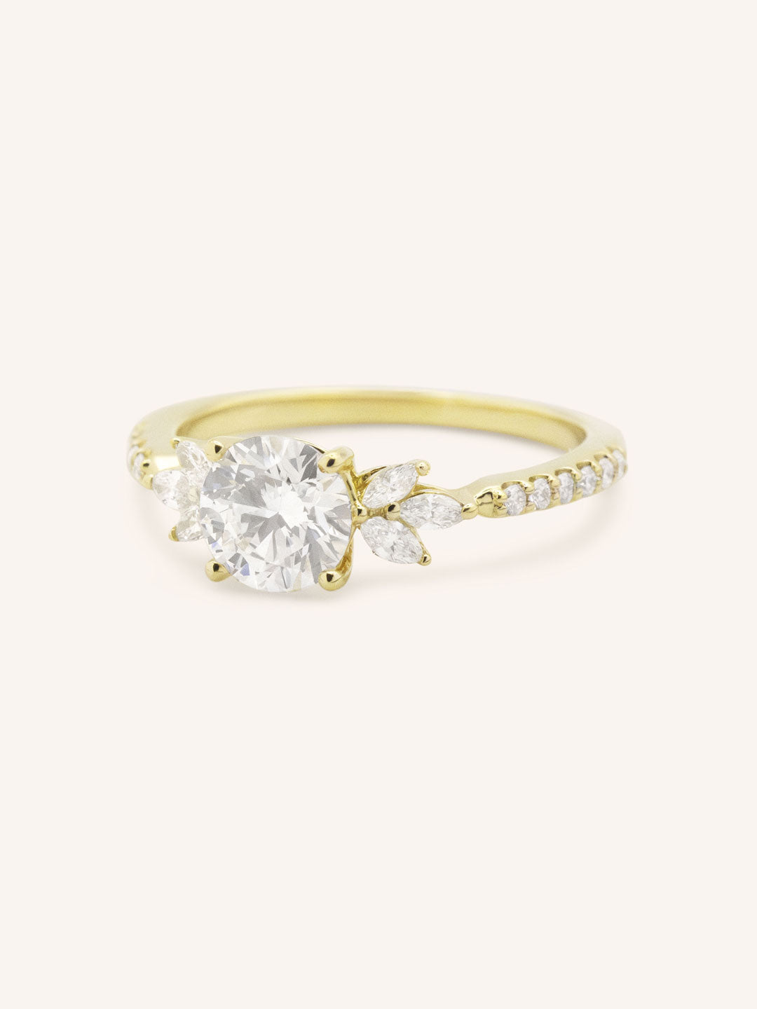 The Melina Dee Diamond Engagement Ring is a masterpiece of natural beauty. Marquise diamonds bloom outward from the center stone, evoking the grace of petals, while accent diamonds line the band for added brilliance. This distinctive design captures elegance and romance, making it a perfect symbol of your love story.