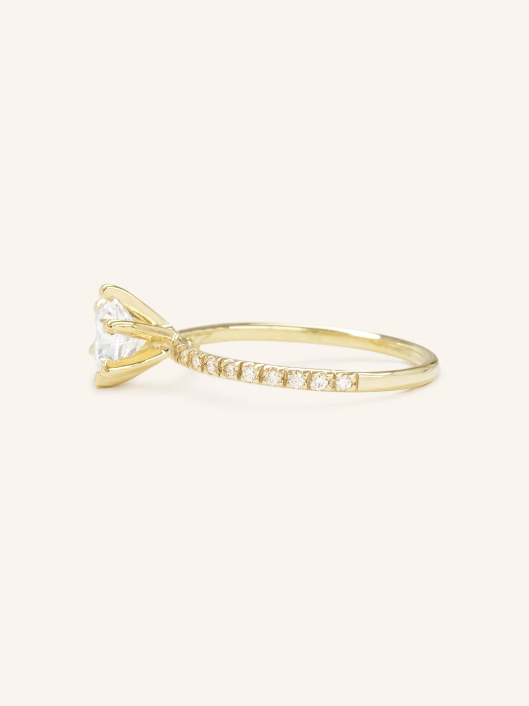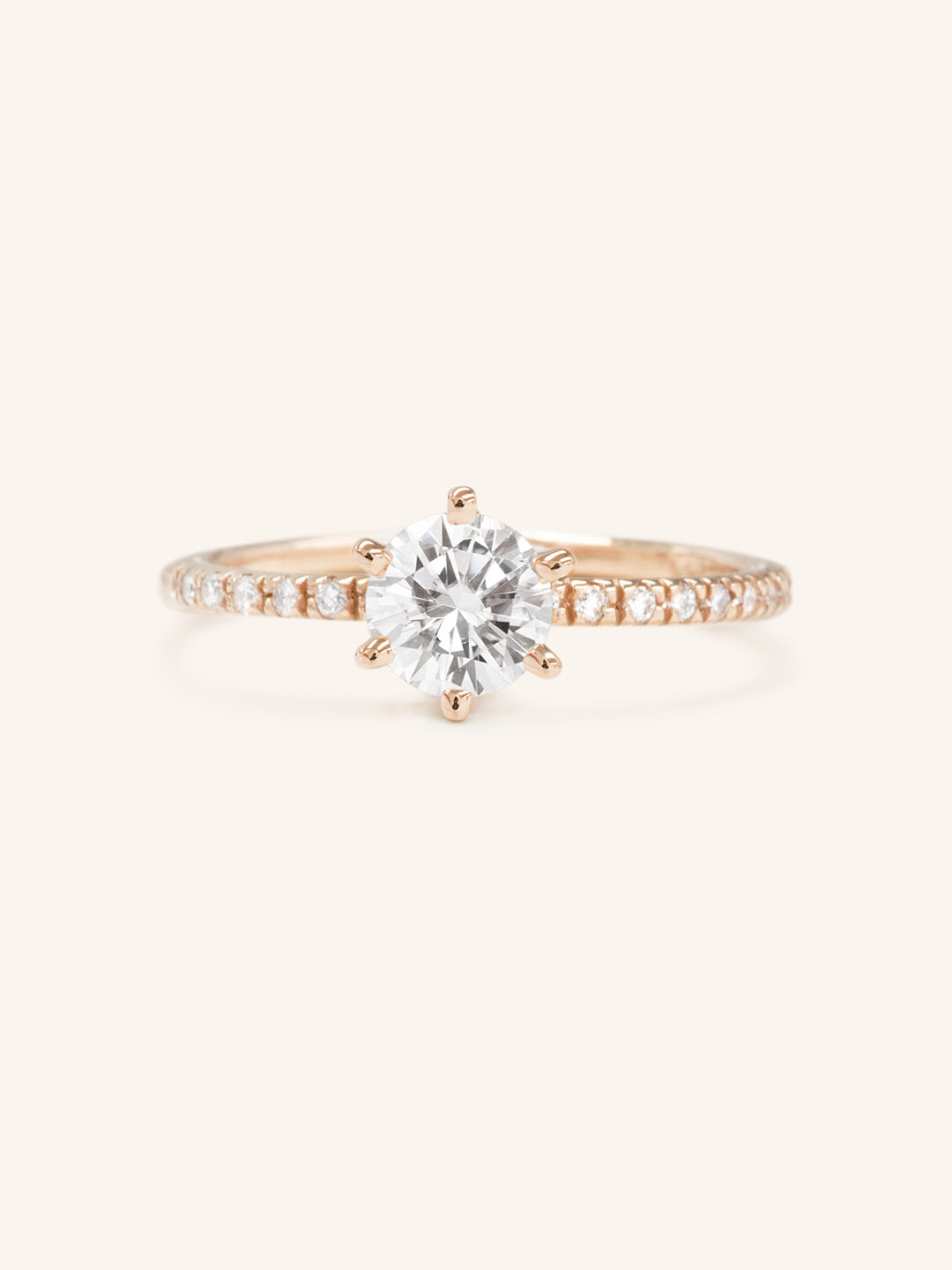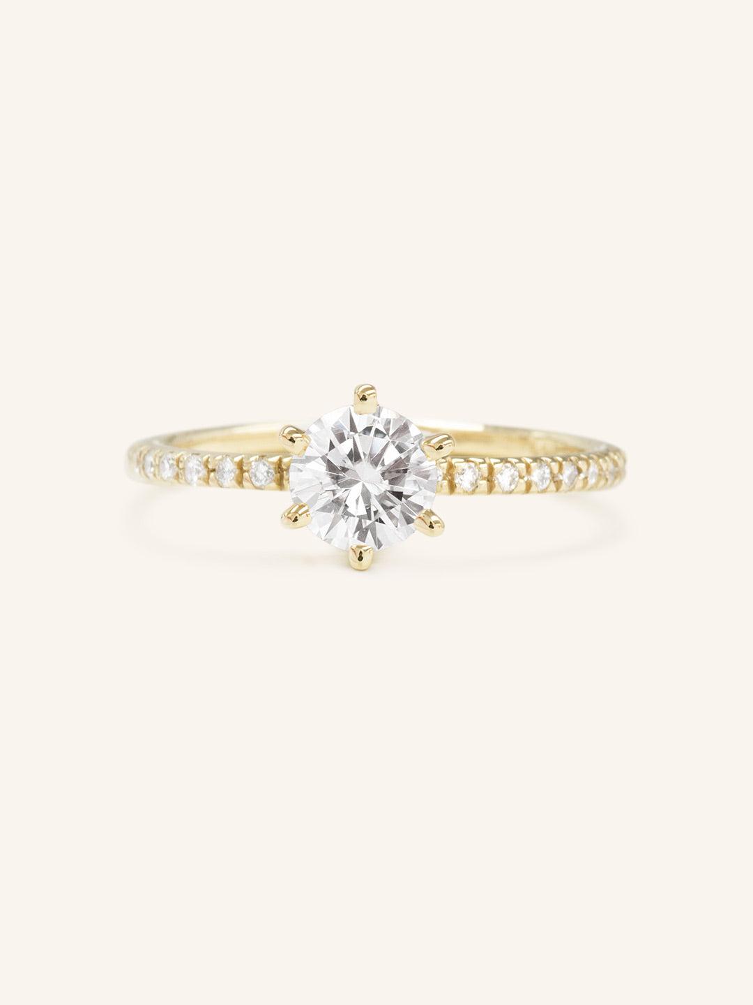 A beautiful bouquet of wild flowers, walking down the aisle, our Wild Bloom Diamond Engagement Ring is the perfect complement. The moissanite center stone - considered by some to be even more beautiful than diamonds, combined with a classic 6 prong diamond setting creates a delicate ring so simple and sweet as the sap in the field.
