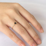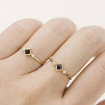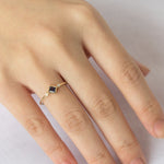 Wildflowers represent a joy that is colored in the most amazing hues. The Wildflower ring emulates this happiness with a petite ring you can stack or wear alone. It features a minimal princess cut gemstone bezel-set diagonally embellished by two luminous diamonds to make the rich colors of the ring blossom.