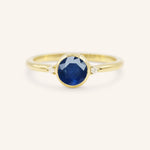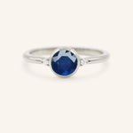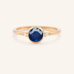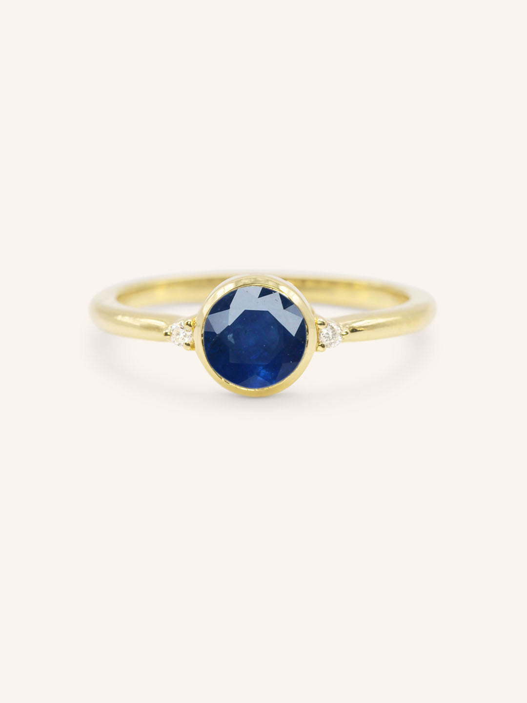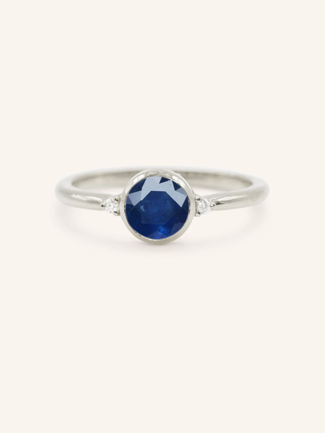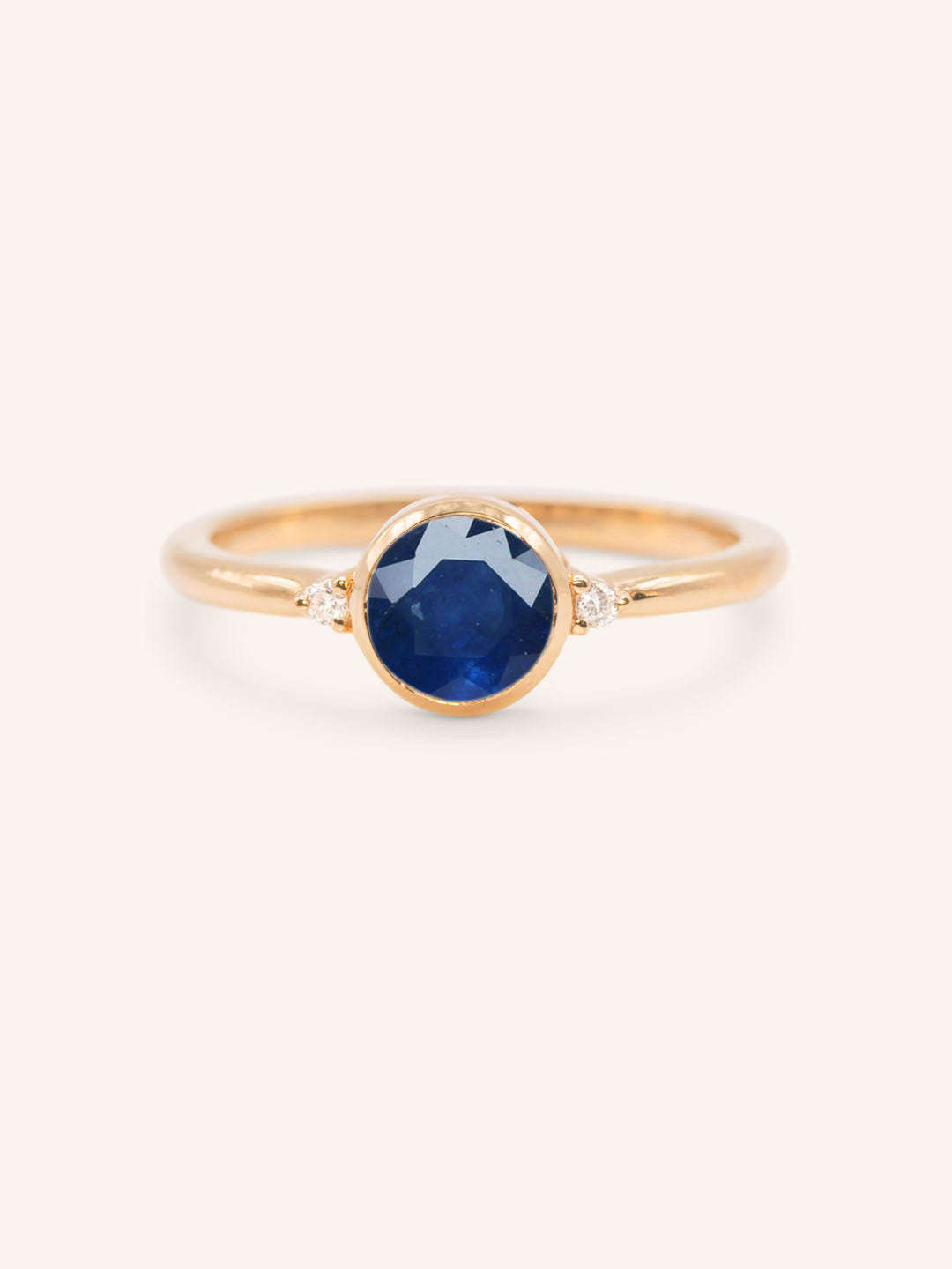 The Templa Ring is a refined three-stone design, perfect for celebrating meaningful moments. A bezel-set center stone, representing a birthstone, is flanked by two dazzling diamonds, creating a balanced and elegant look. This timeless piece is both personal and sophisticated, making it a perfect choice for everyday wear or special occasions.