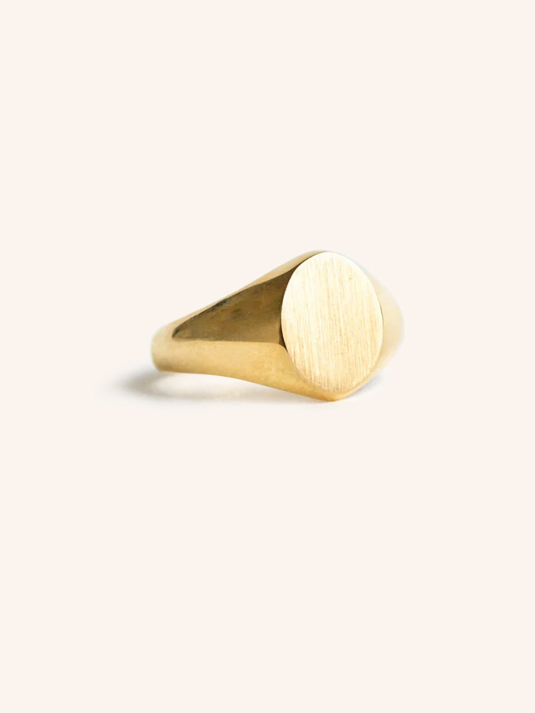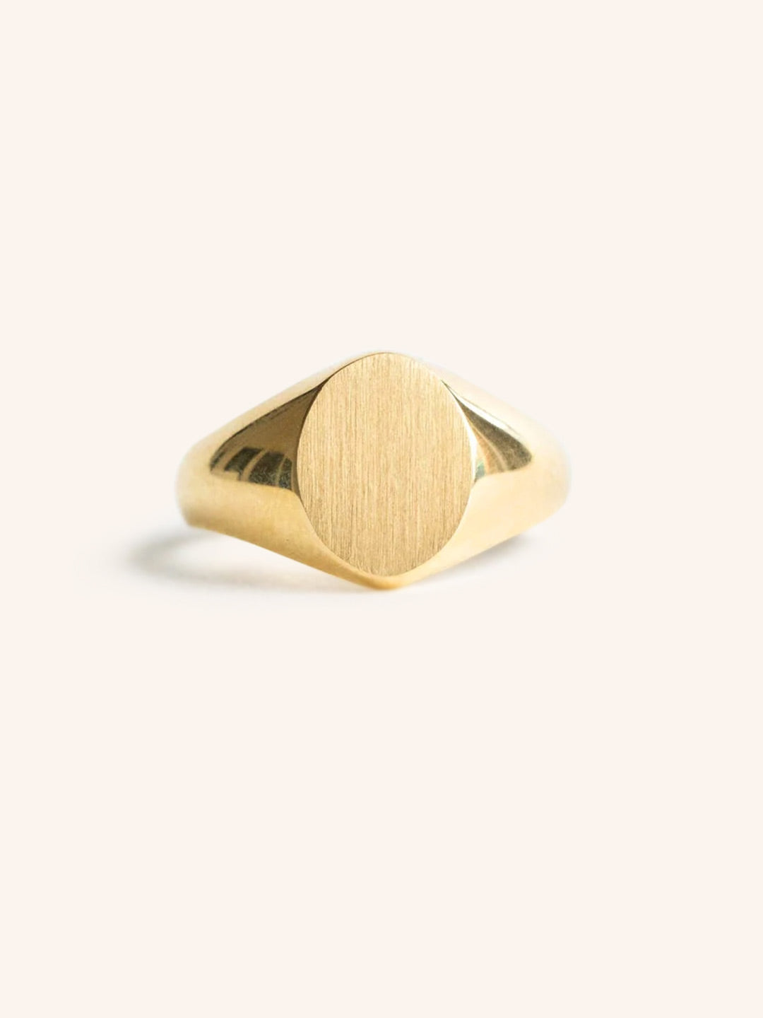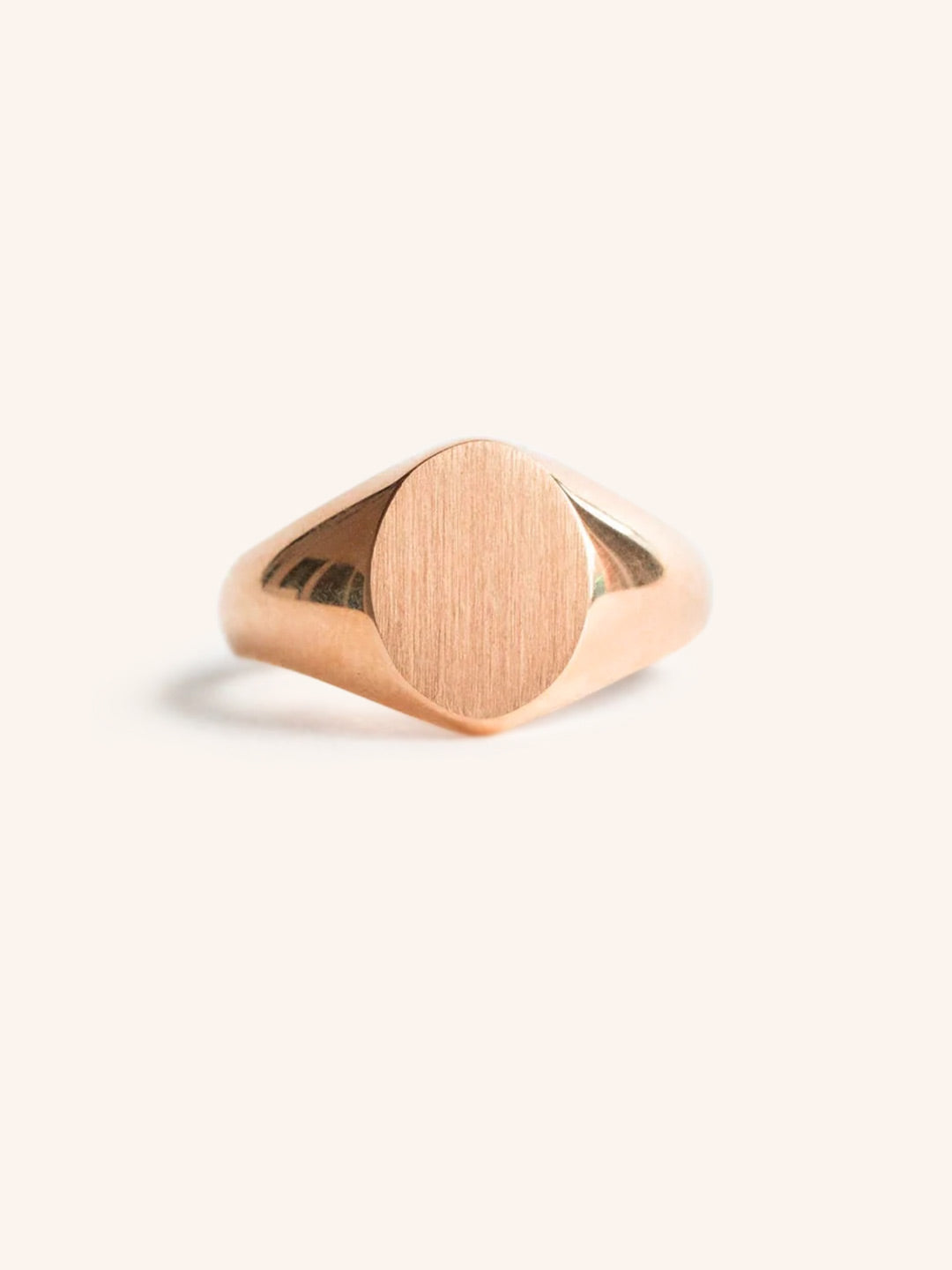 Add a personal touch to your style with our Oval Signet Ring. Its elegant, brushed finish gives a sophisticated look while the oval shape adds a modern twist. Plus, it can be engraved for a unique and meaningful touch.