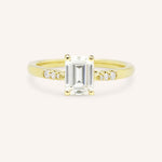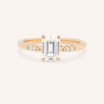The Hotaru Diamond Engagement Ring blends minimalist elegance with a touch of sparkle. Featuring an emerald cut center diamond flanked by delicate accent stones, this design offers a balanced, timeless look. Its clean lines and refined details make it a graceful choice for those who appreciate understated beauty.