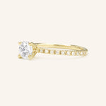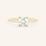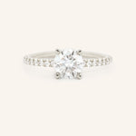 This ring features a Charles & Colvard Forever One Round Brilliant Cut Moissanite with a selection of carat weight from 0.68 ctw to 2.26 ctw. We offer an option of stone color grading from near colorless (GHI) to colorless (DEF).