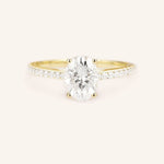 Our Morning Rose Diamond collection features four prongs as well as a cathedral which elevates the stone enhanced by twenty brilliant diamonds along the side of this classic solid gold engagement ring.