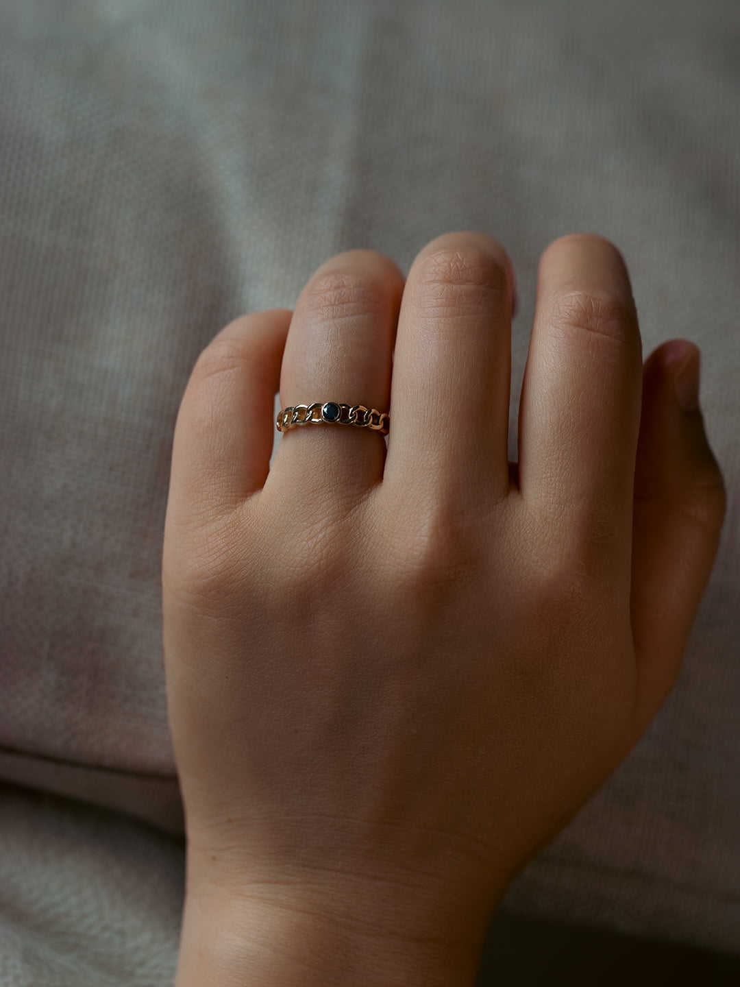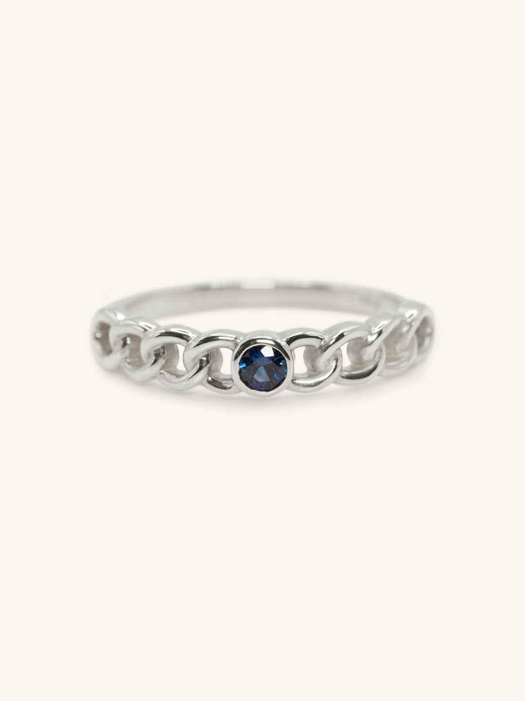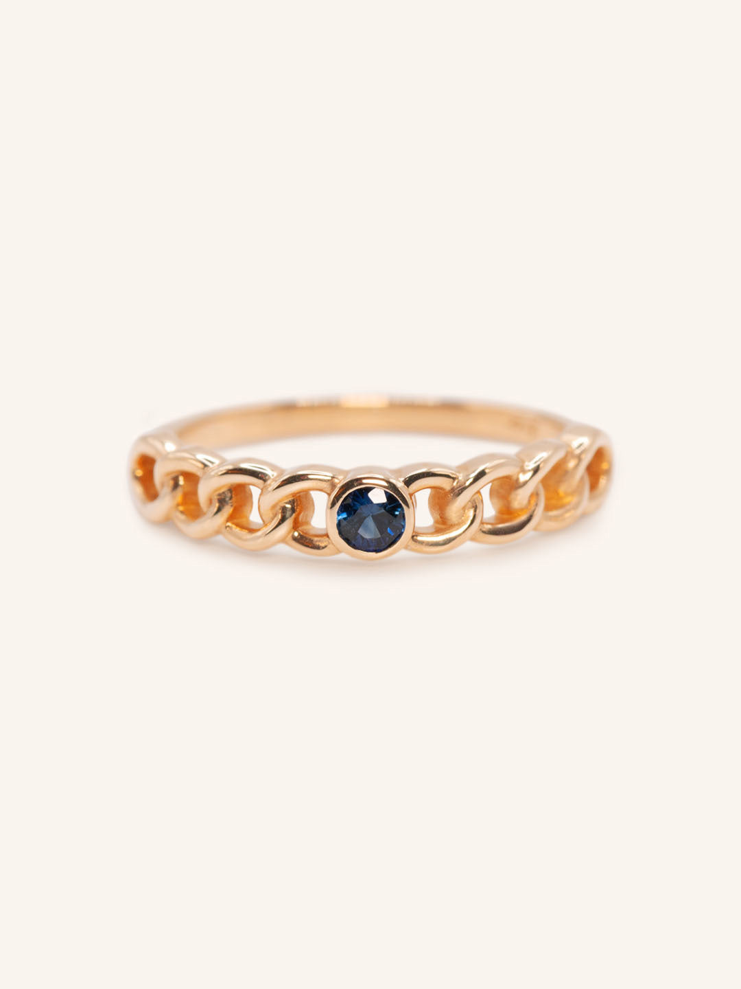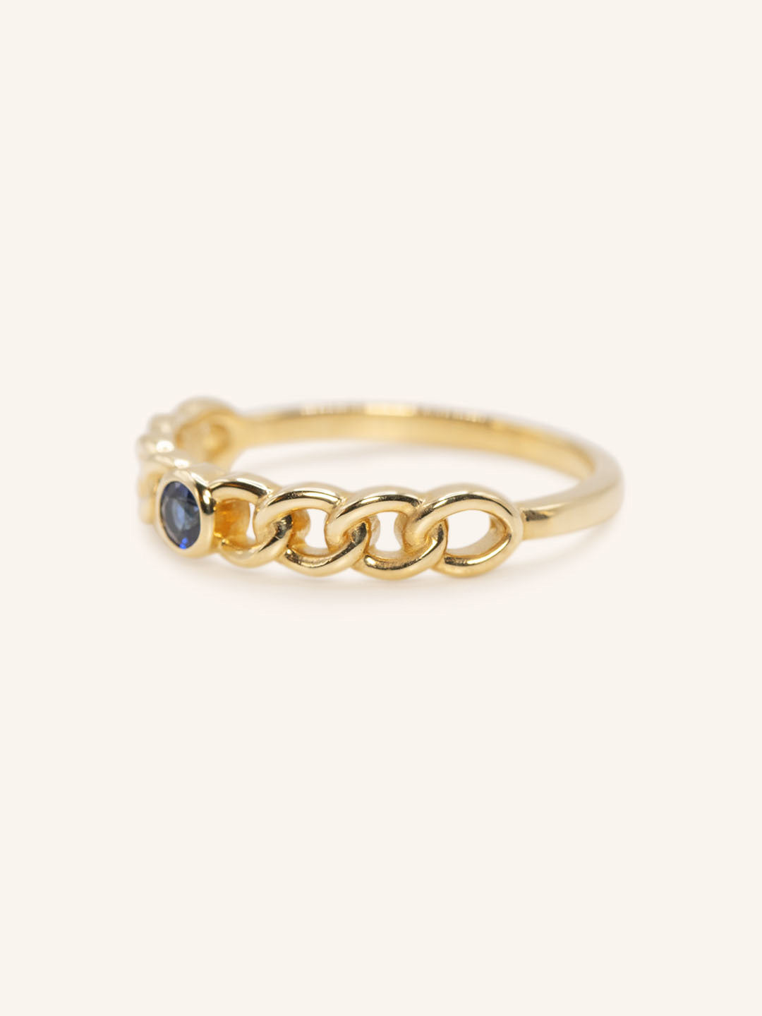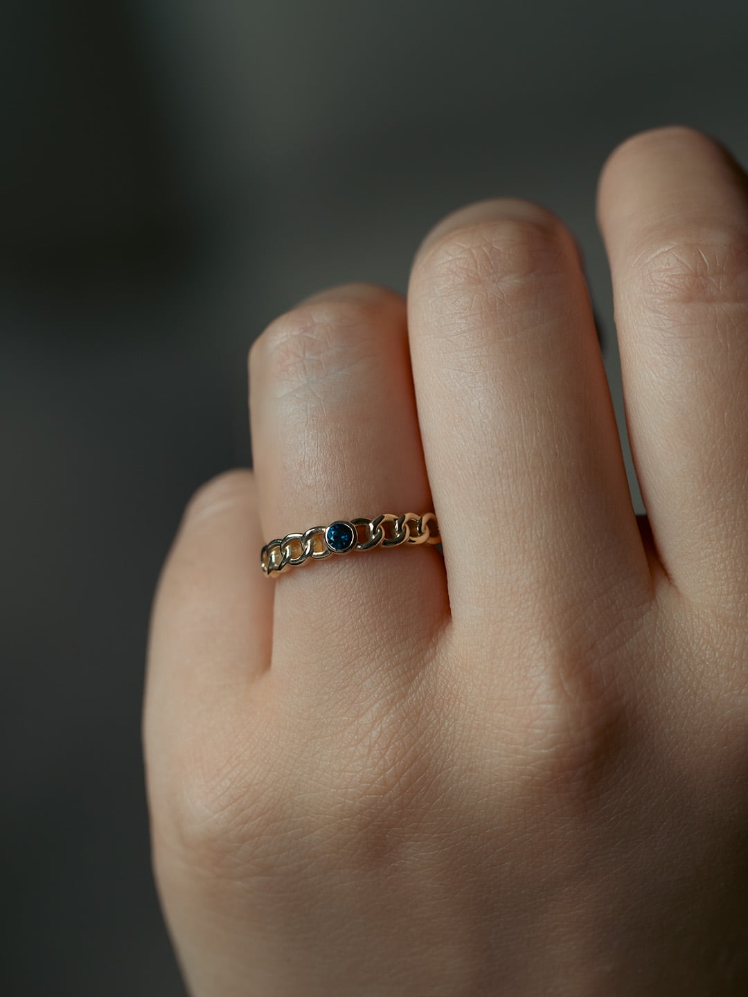 Our Buco Curb Chain Ring combines bold style with timeless elegance, featuring a vibrant blue sapphire set within a striking curb chain design. This unique ring adds a touch of sophistication and color to any ensemble, making it a standout piece in your jewelry collection. Celebrate your individuality with this exquisite and eye-catching ring, designed to reflect your unique style.