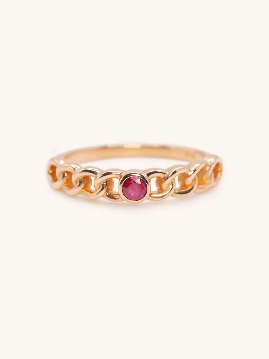 Our Buco Curb Chain Ring combines bold style with timeless elegance, featuring a vibrant ruby set within a striking curb chain design. This unique ring adds a touch of sophistication and color to any ensemble, making it a standout piece in your jewelry collection. Celebrate your individuality with this exquisite and eye-catching ring, designed to reflect your unique style.