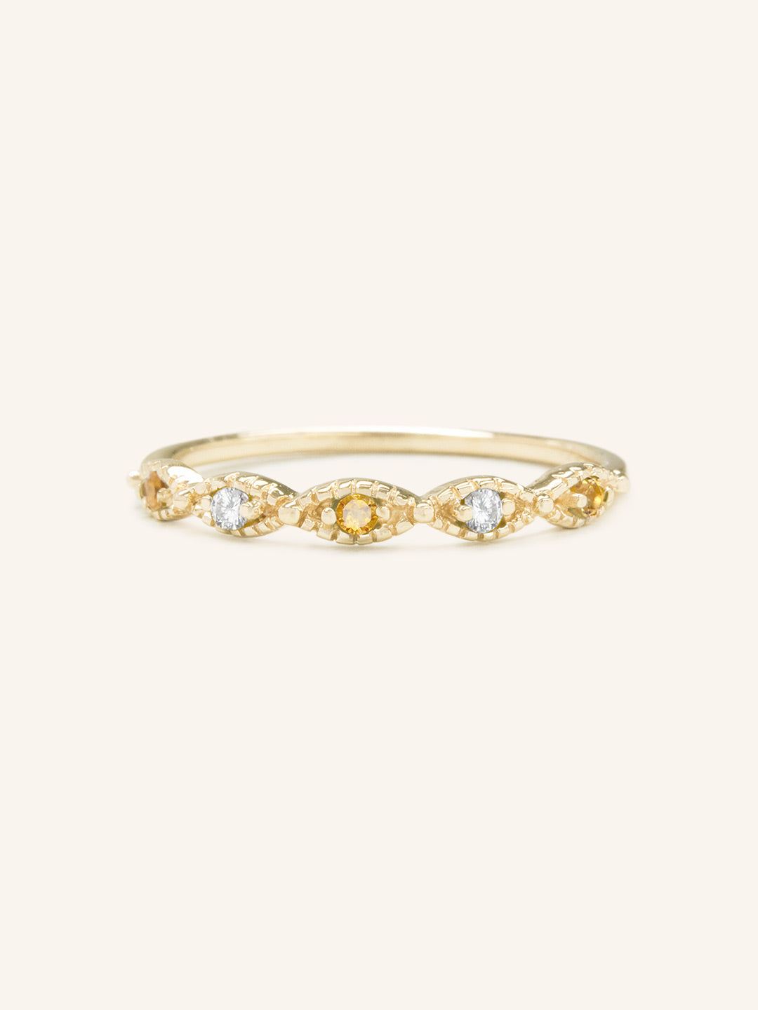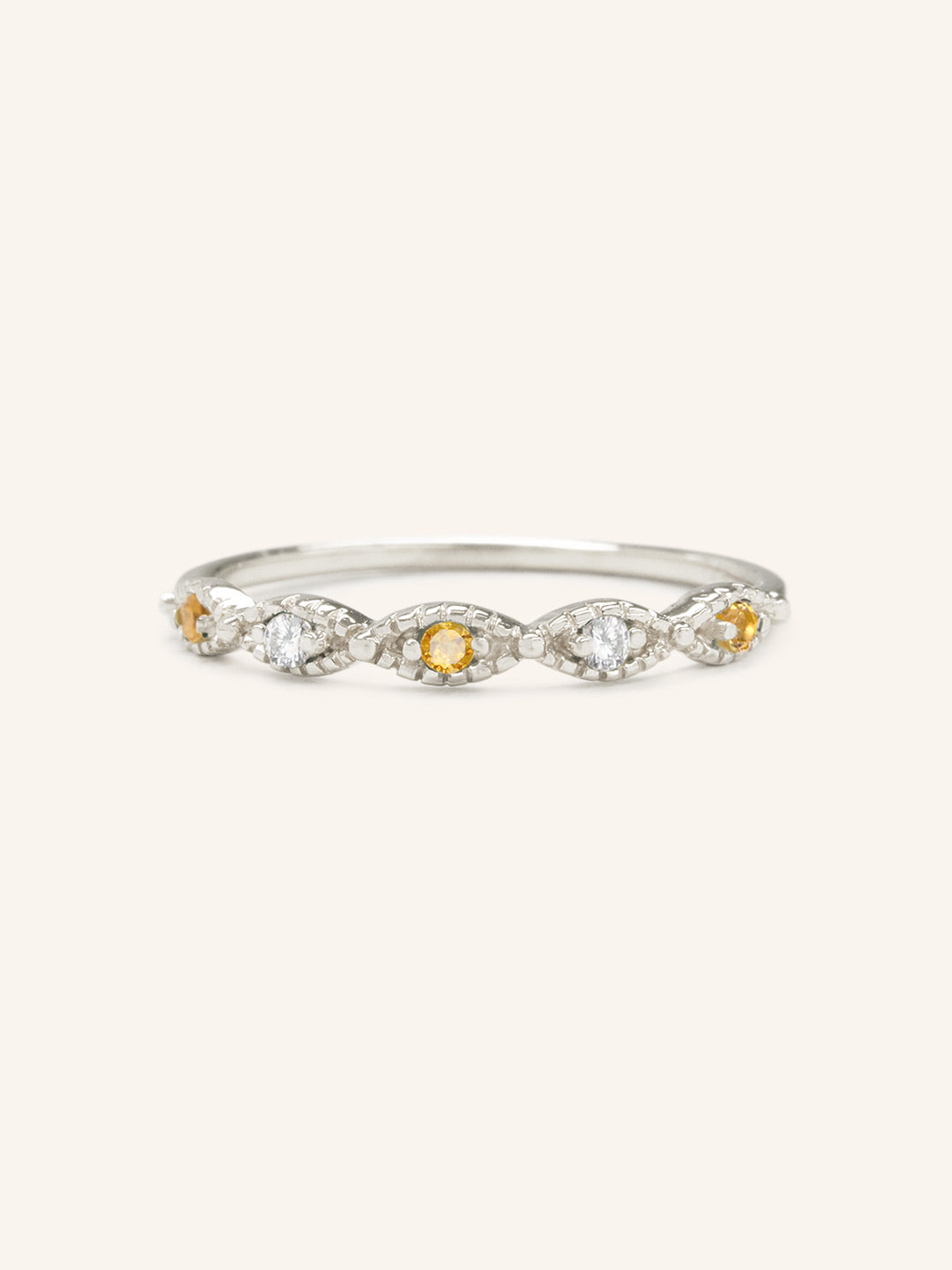 A timeless, elegant and sophisticated accessory for any occasion. This ring is designed to draw attention and make a statement. Featuring our custom cut design, with a special way of mixing metallic sequins and gemstones to create a truly unique look every time it is worn.