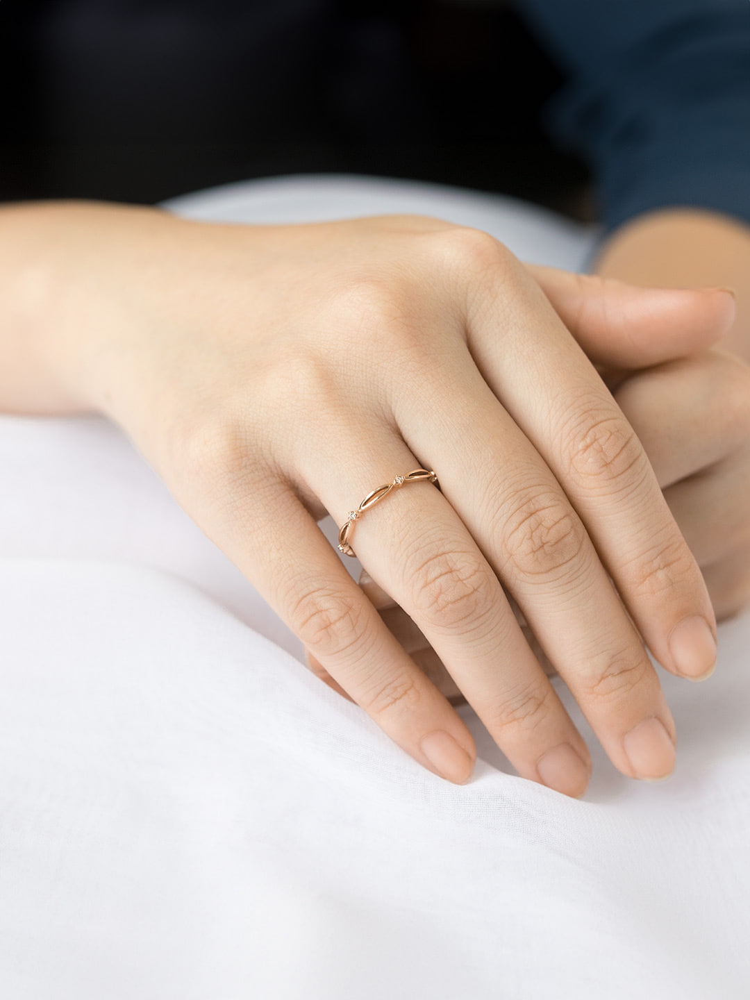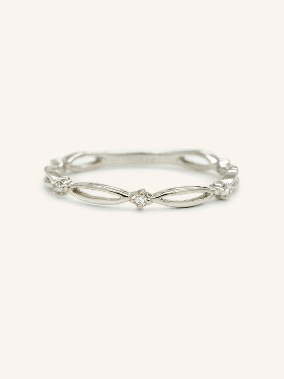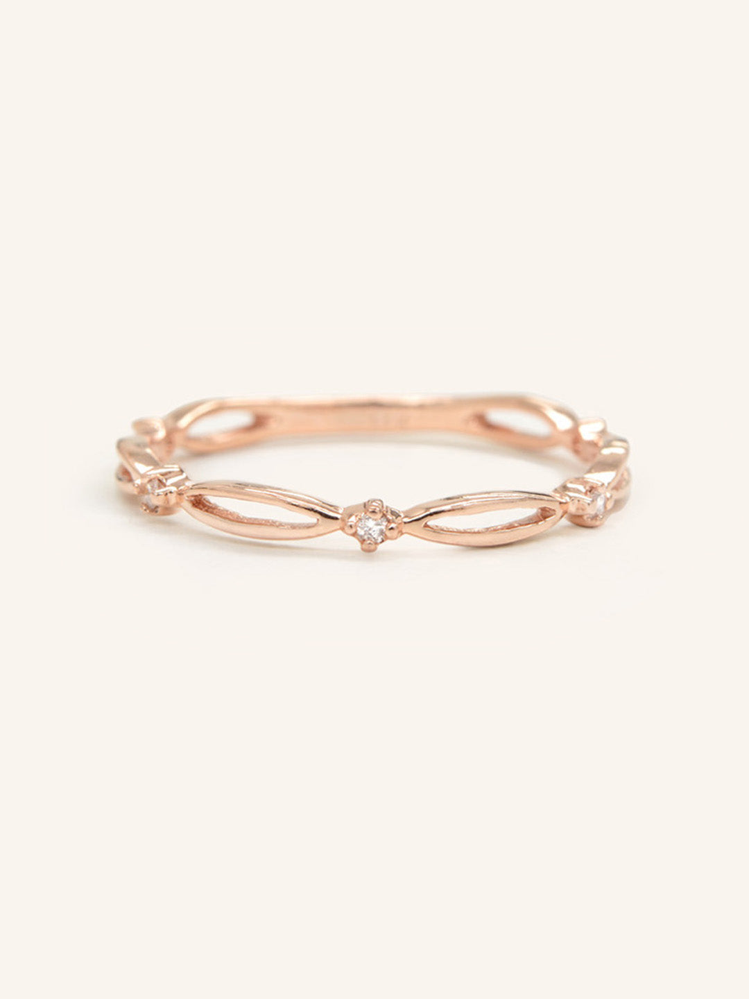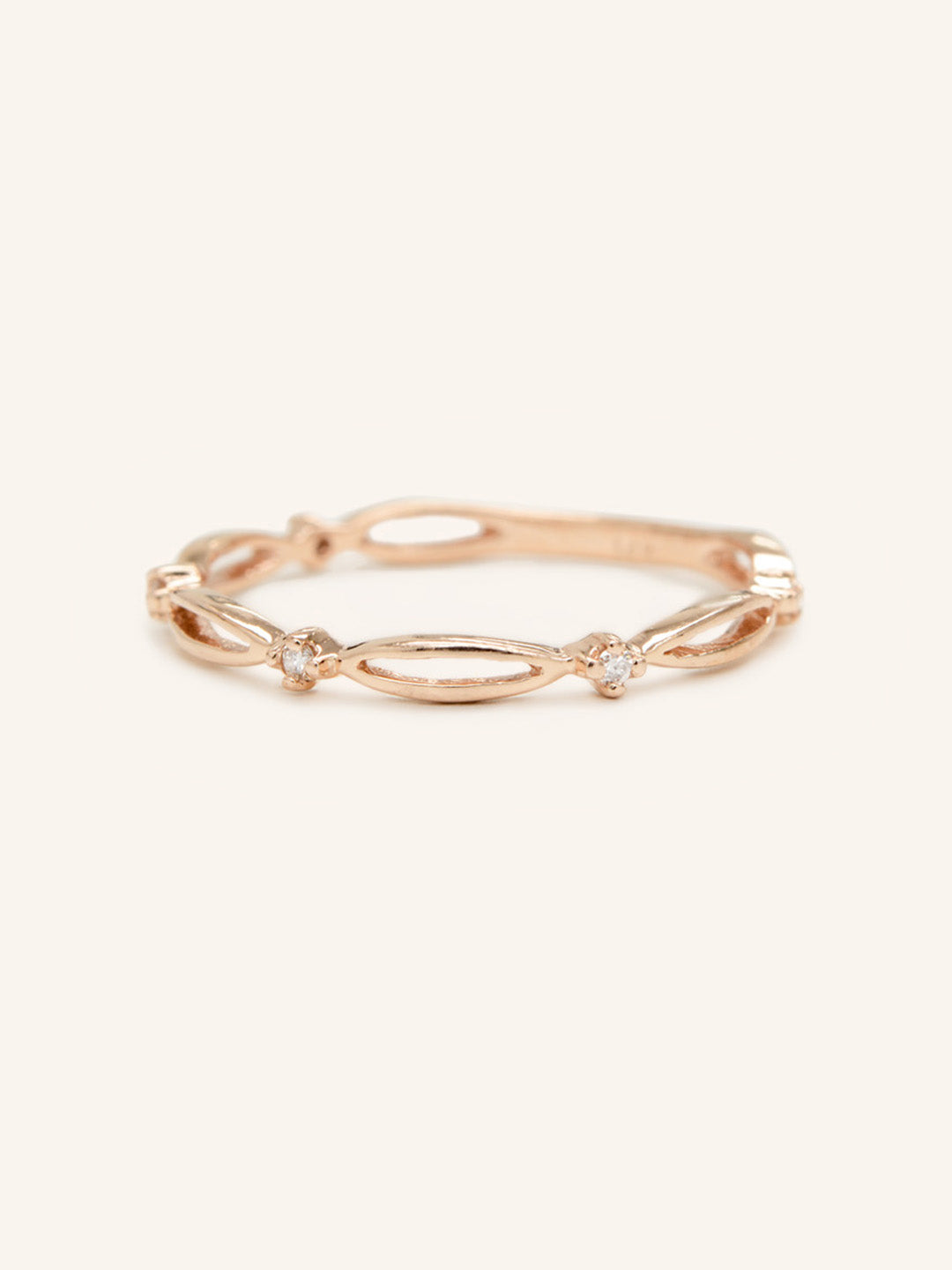 A dainty everyday essential to your lookbook. This stackable diamond ring enhances your outfit from day to night. It is a gorgeous stackable ring that features five round diamonds evenly spaced out between open braids - a gift that you deserve.