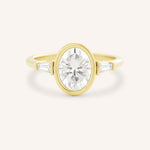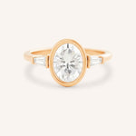 A bezel-set center stone is framed by baguette side diamonds, symbolizing the strength of past, present, and future. A refined design for the one who cherishes love’s enduring journey. This timeless ring is made to celebrate a bond that only grows stronger with time.