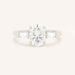 Lavish, glamorous - is how we would describe this art deco style engagement ring with its beautiful tapered baguettes, adding a modern style to this classic three stone engagement ring.