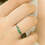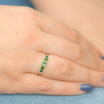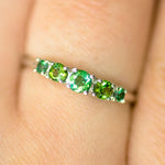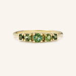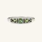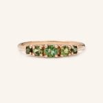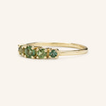 Hand selected green tourmalines with different graduation of colors from yellow to teals, we love this unique color wedding band to wear with your engagement ring or comfortable alone.