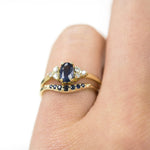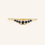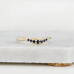 A deep shade of blue adorned with gold. The Blue Shade Sapphire Wedding Ring is a vintage style curved wedding band that features 7 brilliant round genuine blue sapphire. This would be great to add a complimentary color to your engagement ring.