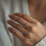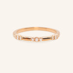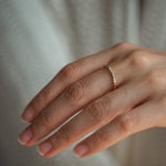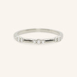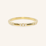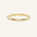 The Cabot Spaced Diamond Wedding Band showcases a modern design with carefully spaced diamonds along a sleek 14k gold band. The evenly spaced diamonds create a subtle yet refined sparkle, offering a minimalist and elegant look that complements any engagement ring or stands beautifully on its own. Perfect for those seeking a timeless yet contemporary wedding band, the Cabot is a graceful symbol of your love and commitment.