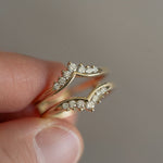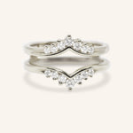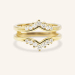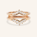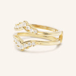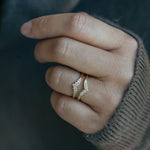 The Granby Double Band Diamond Ring Guard features a sleek V-shaped design with two shimmering 14k gold bands, each lined with sparkling diamonds. Designed to frame your engagement ring with elegance, this guard adds both brilliance and a contemporary touch to your jewelry. The Granby ring guard is perfect for enhancing your solitaire with a bold yet sophisticated look, making it an ideal choice for those seeking added sparkle and style.
