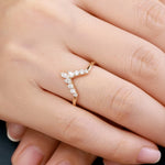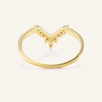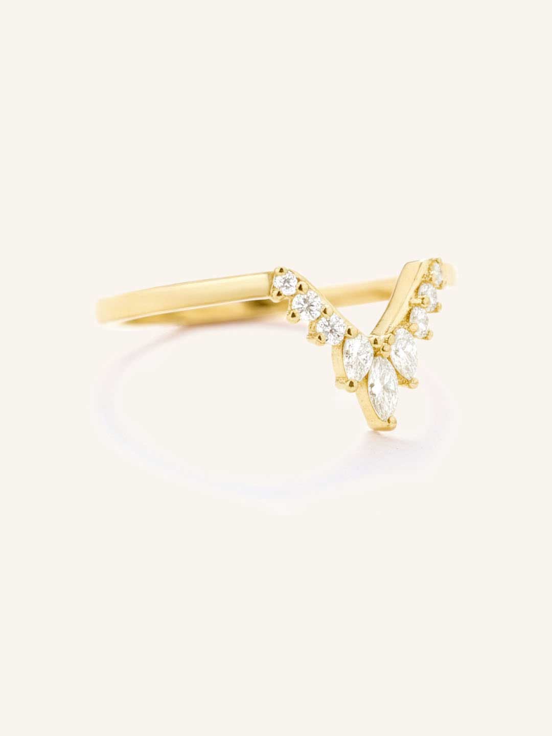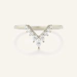 The Joni Marquise Diamond V Wedding Ring showcases a striking V-shaped band adorned with multiple marquise diamonds, creating a captivating, elongated look. The design’s sharp angles and radiant diamonds come together to form a unique and modern wedding band. This sophisticated piece is perfect for those seeking a contemporary yet timeless ring to symbolize their love and commitment.