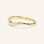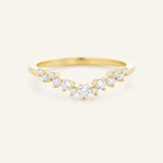 The Misty Curved Diamond Wedding Band features a delicate curve resembling a sparkling constellation, with diamonds artfully arranged to evoke celestial beauty. This unique design adds a touch of brilliance and whimsy, making it the perfect accent to your engagement ring or a dazzling standalone piece.