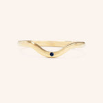 A solid 14k gold curved ring with blue sapphires burnished evenly throughout the ring, adding a little accent to a minimal wedding band. Definitely perfect to go with your faded denim jeans.