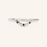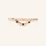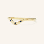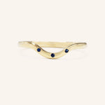 A solid 14k gold curved ring with blue sapphires burnished evenly throughout the ring, adding a little accent to a minimal wedding band. Definitely perfect to go with your faded denim jeans.