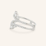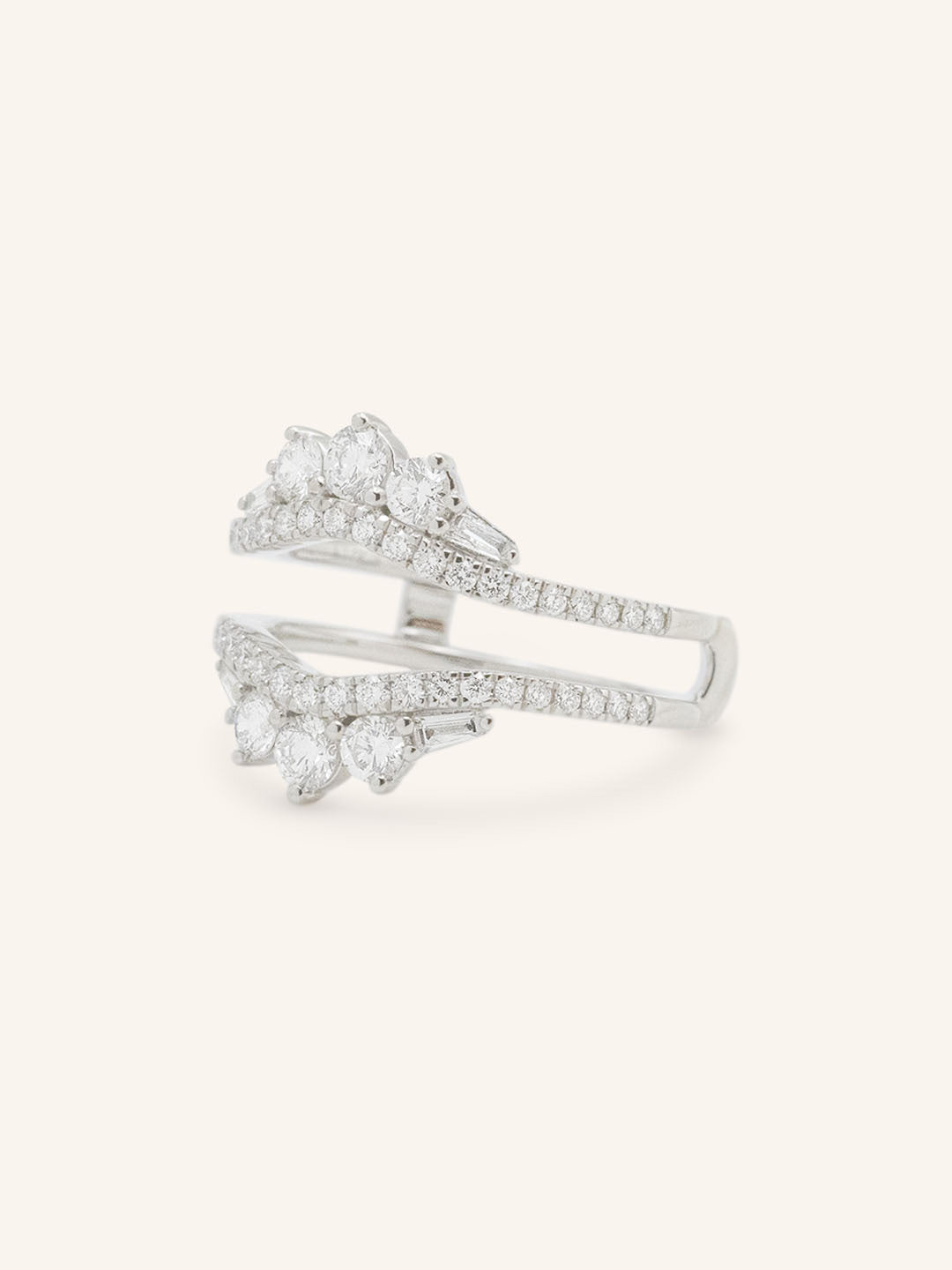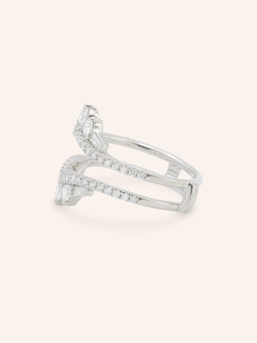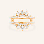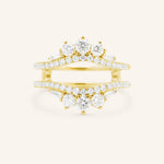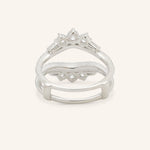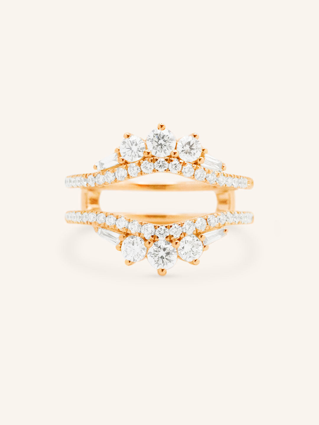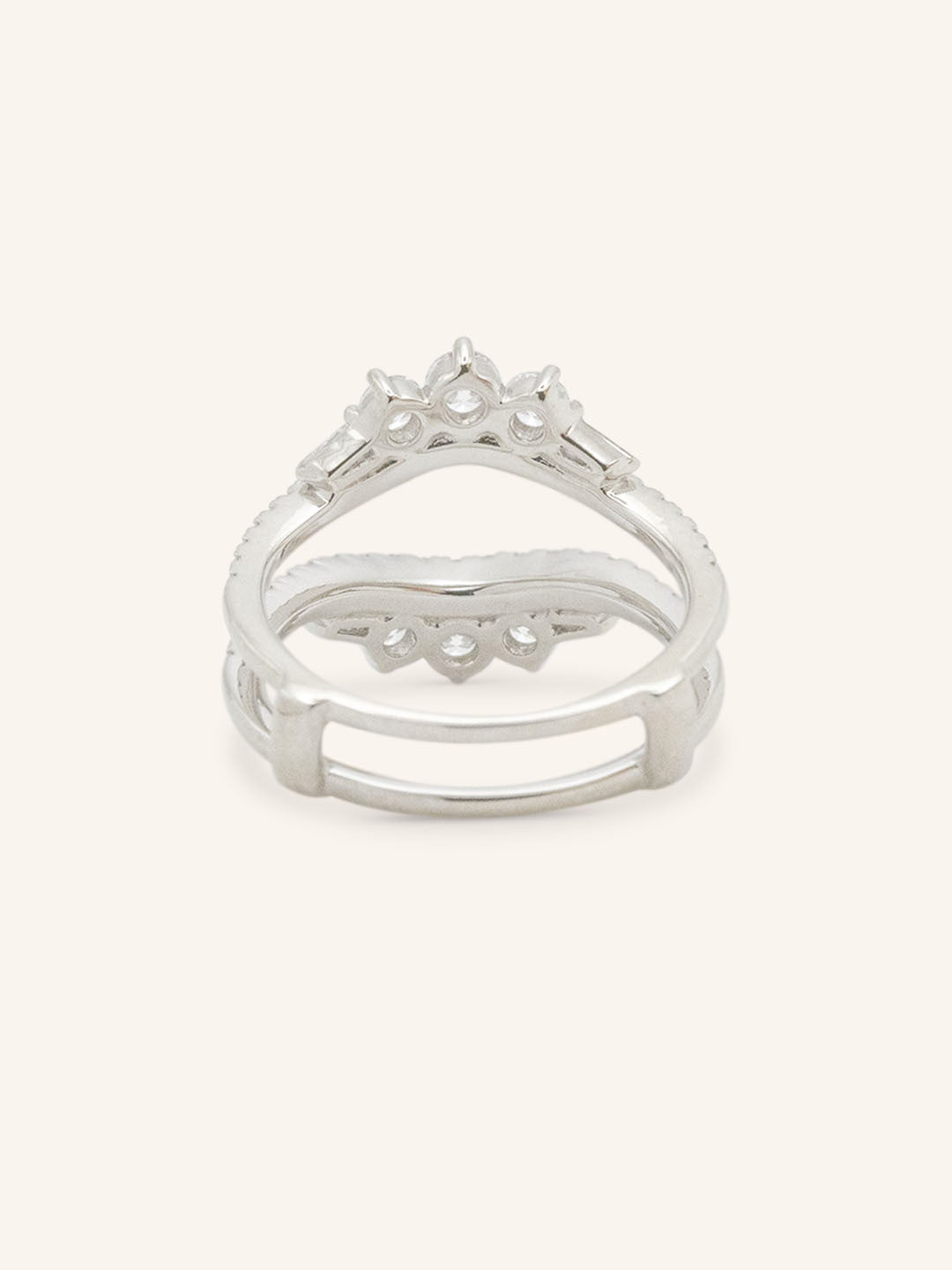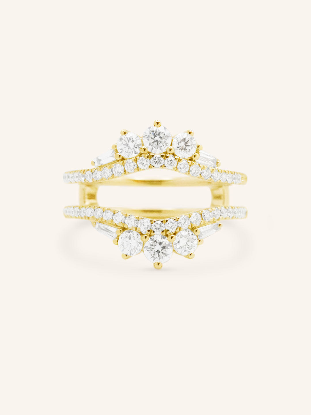 The Theresa Double Band Diamond Ring Guard is a stunning design that enhances any engagement ring with its dual curved bands. Set with sparkling diamonds, this piece adds dimension and brilliance while perfectly framing your ring. Ideal for creating a cohesive and sophisticated bridal set.