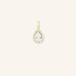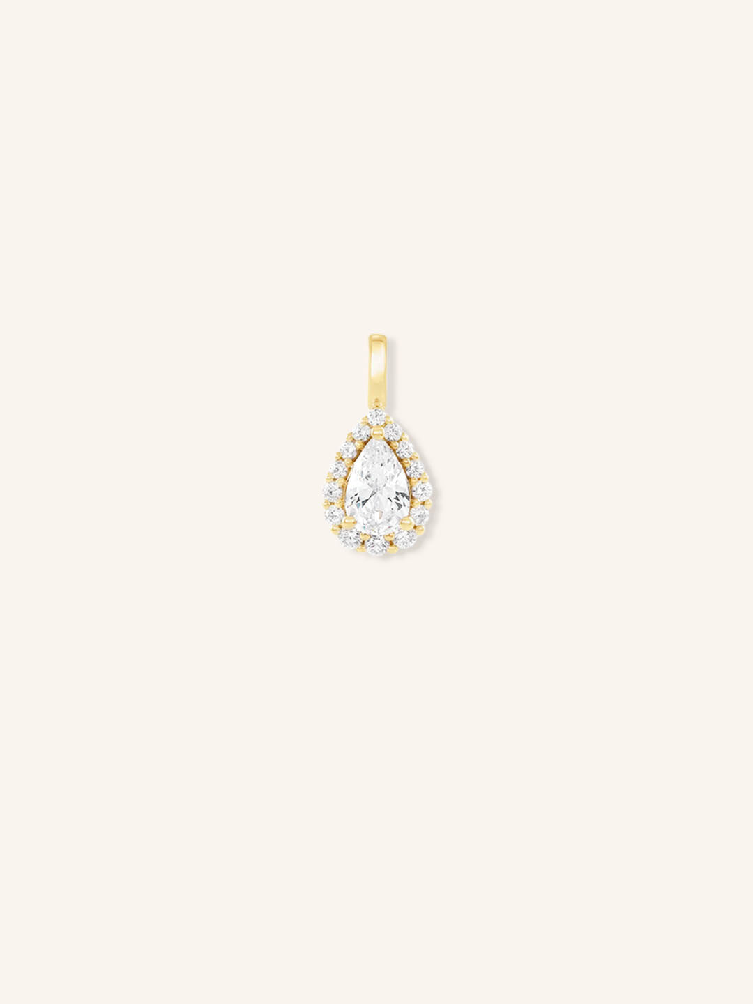 A gold-tone pendant featuring a pear-shaped diamond centerpiece encircled by smaller diamonds, set against a plain background.