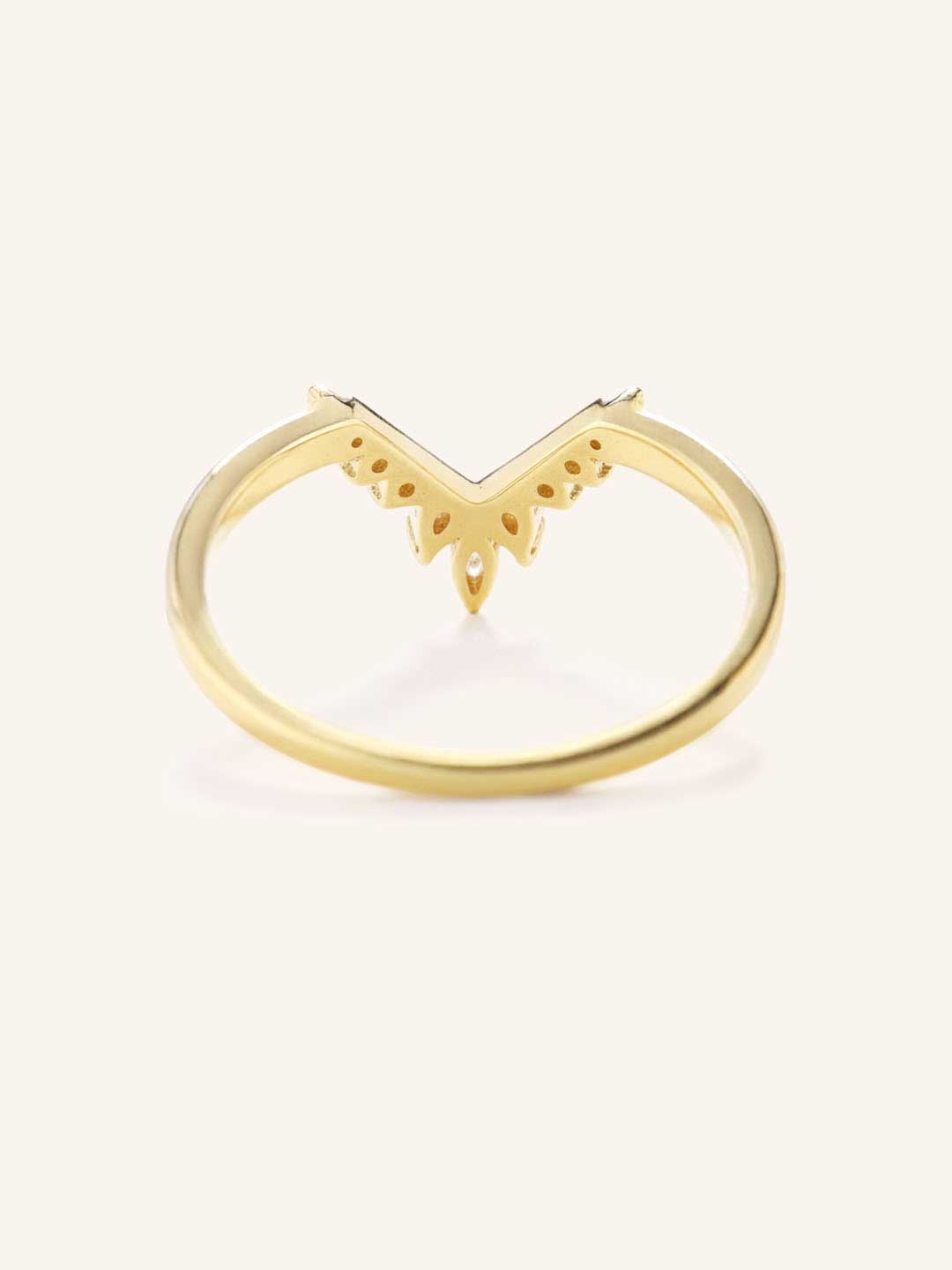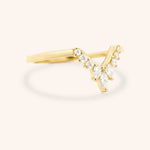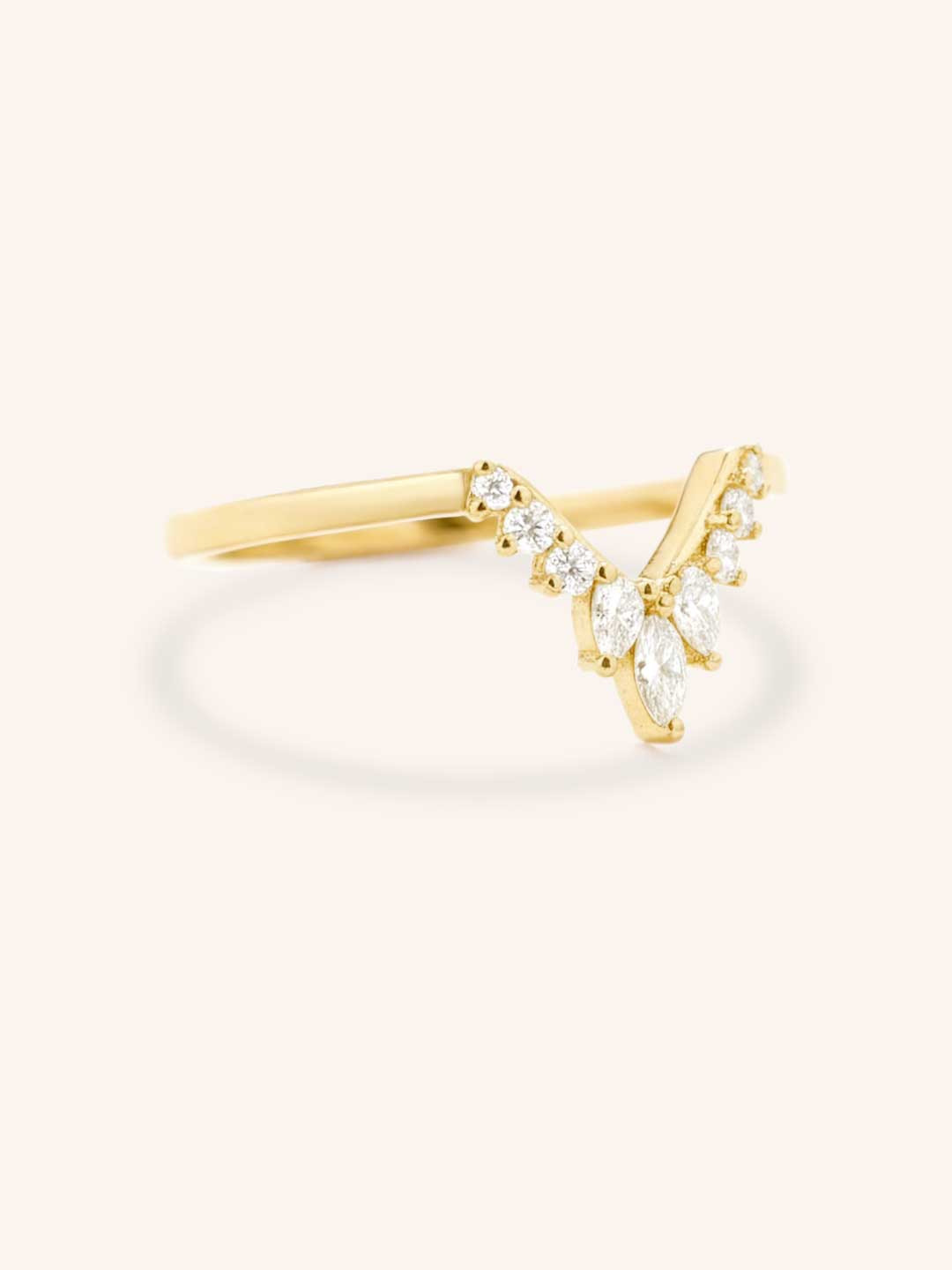 The Joni Marquise Diamond V Wedding Ring showcases a striking V-shaped band adorned with multiple marquise diamonds, creating a captivating, elongated look. The design’s sharp angles and radiant diamonds come together to form a unique and modern wedding band. This sophisticated piece is perfect for those seeking a contemporary yet timeless ring to symbolize their love and commitment.