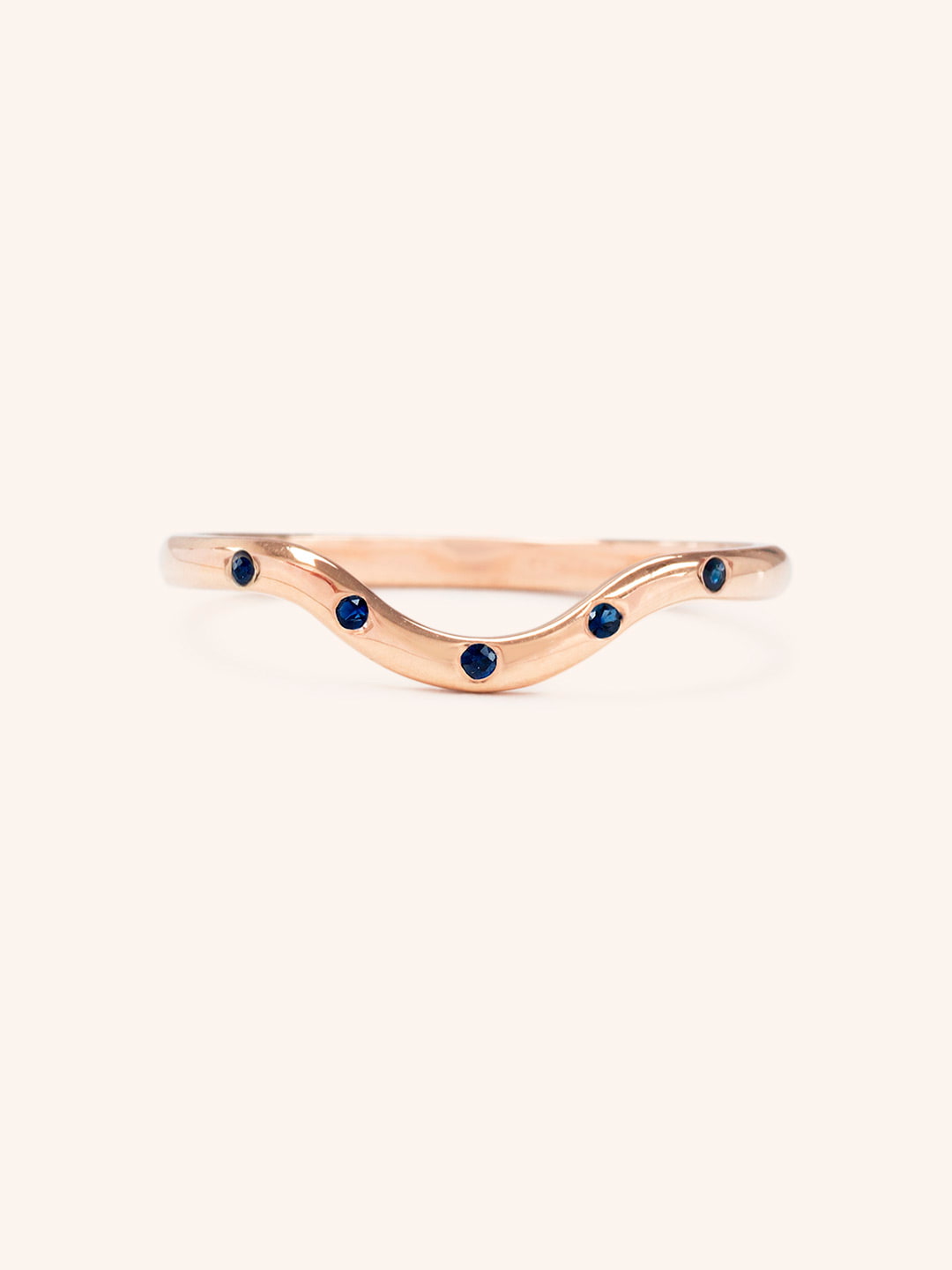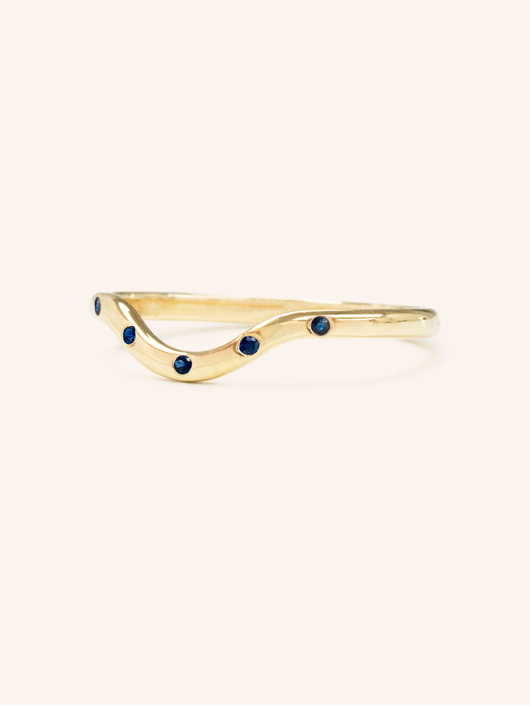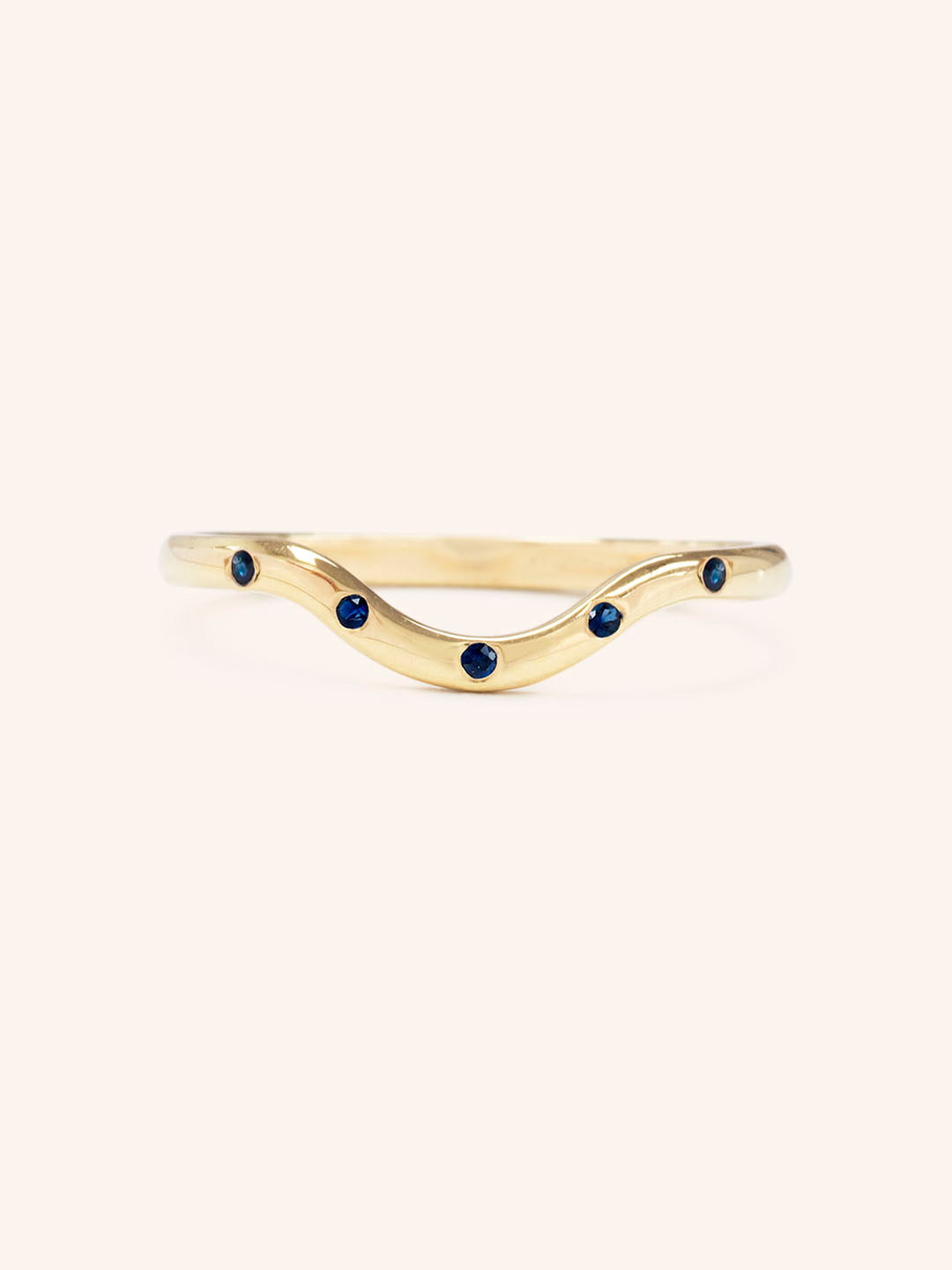 A solid 14k gold curved ring with blue sapphires burnished evenly throughout the ring, adding a little accent to a minimal wedding band. Definitely perfect to go with your faded denim jeans.