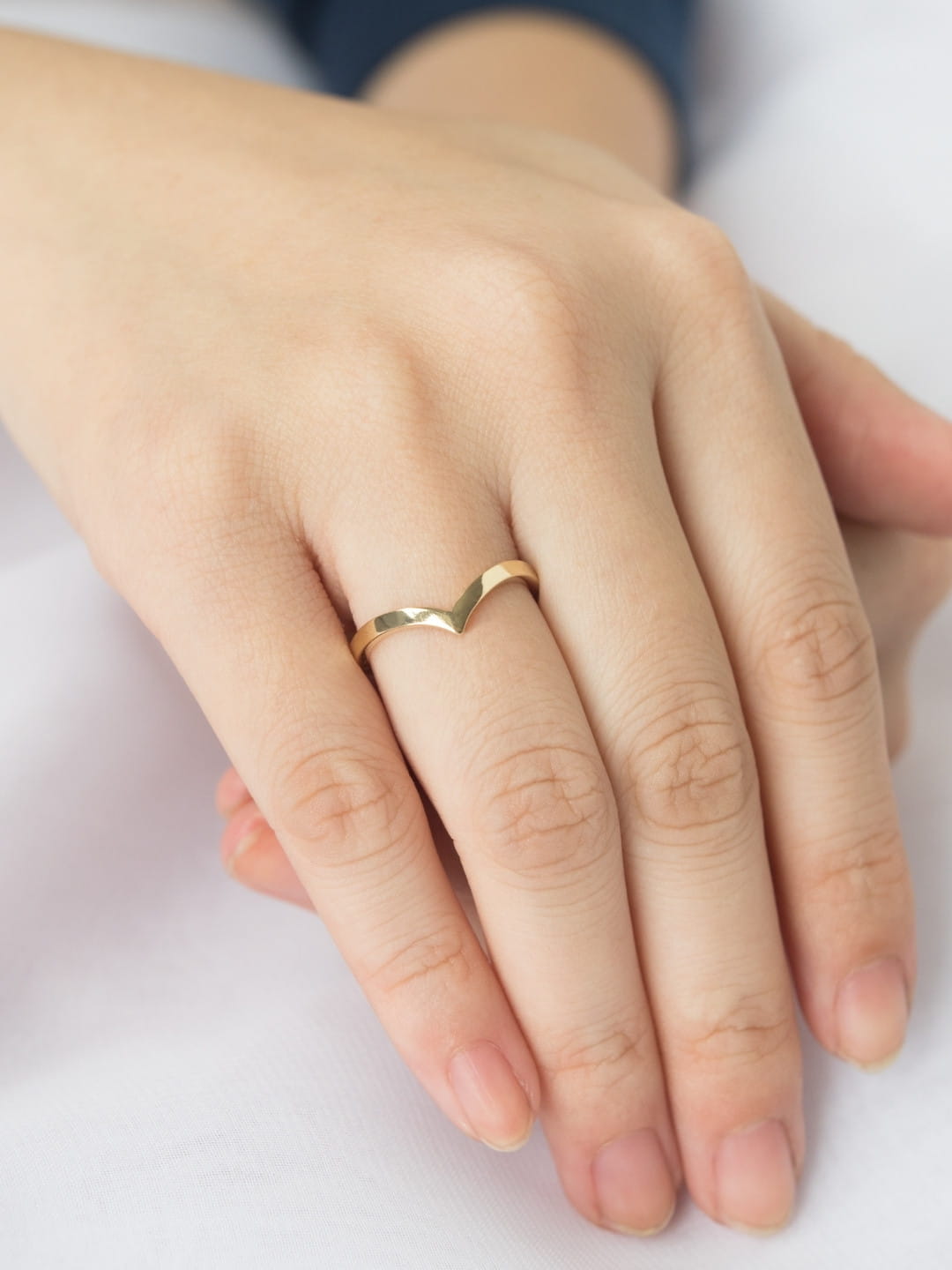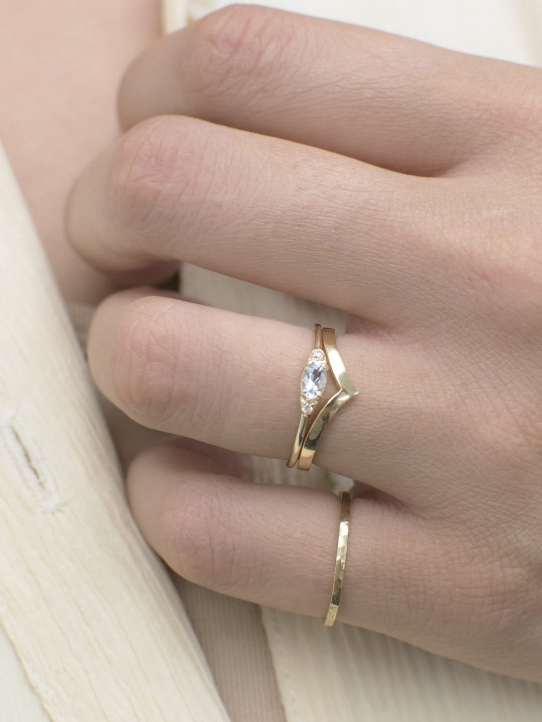The Eveline Ring is a beautifully crafted 14k gold ring that makes an incredibly sleek addition to your engagement ring. The V shape is a modern twist on the traditional rounded edge of popular wedding bands and is designed to provide a flat and smooth surface for daily wear.