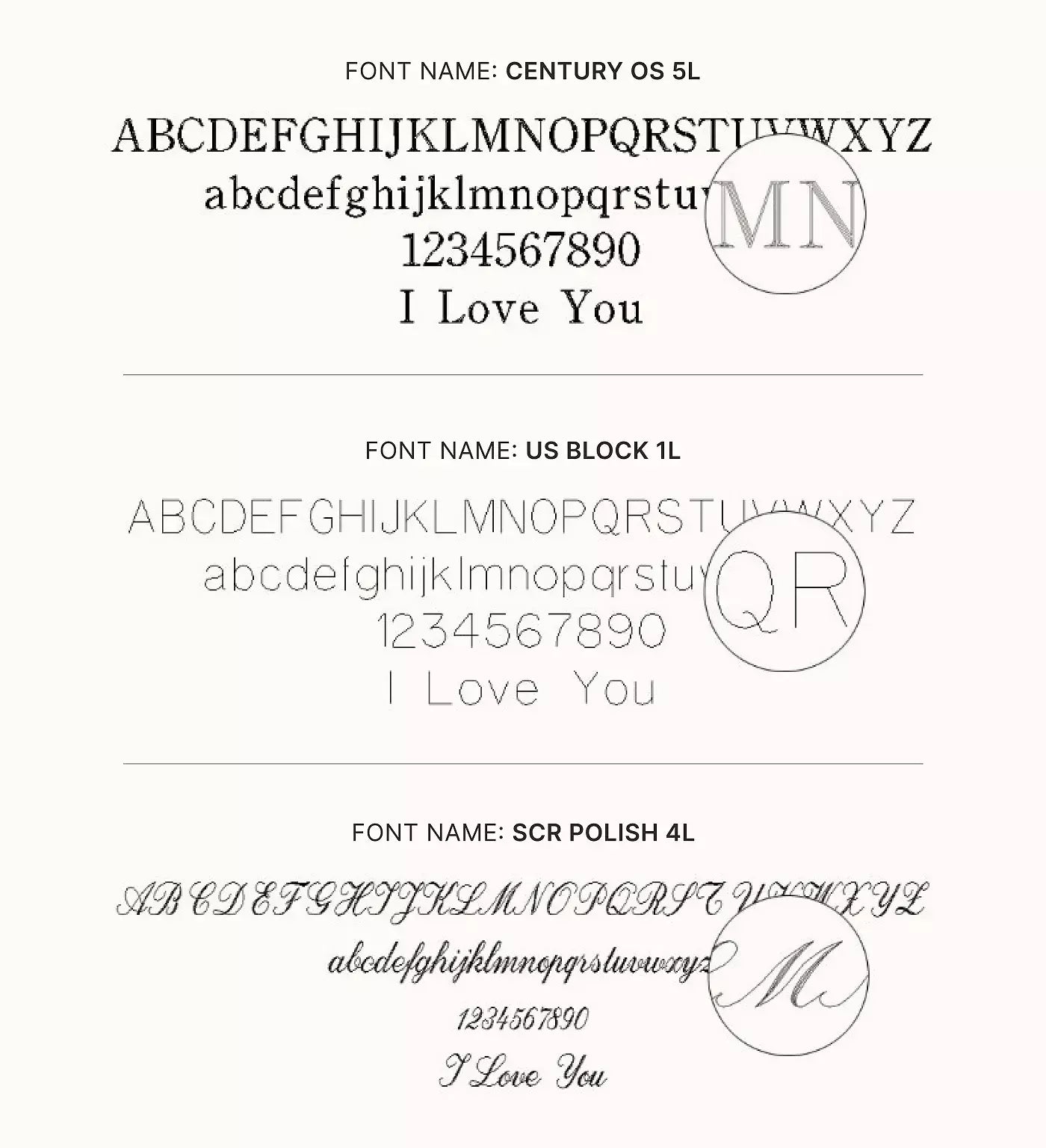 You can pick the font of your choice in both uppercase and lowercase. In the adjacent image, you can find a list of all the fonts you can choose from. In the Notes field at checkout, please specify your font choice and what you’d like to engrave.