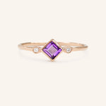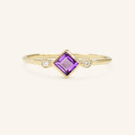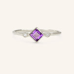 Wildflowers represent a joy that is colored in the most amazing hues. The Wildflower ring emulates this happiness with a petite ring you can stack or wear alone. It features a minimal princess cut gemstone bezel-set diagonally embellished by two luminous diamonds to make the rich colors of the ring blossom.