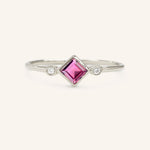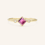Wildflowers represent a joy that is colored in the most amazing hues. The Wildflower ring emulates this happiness with a petite ring you can stack or wear alone. It features a minimal princess cut gemstone bezel-set diagonally embellished by two luminous diamonds to make the rich colors of the ring blossom.