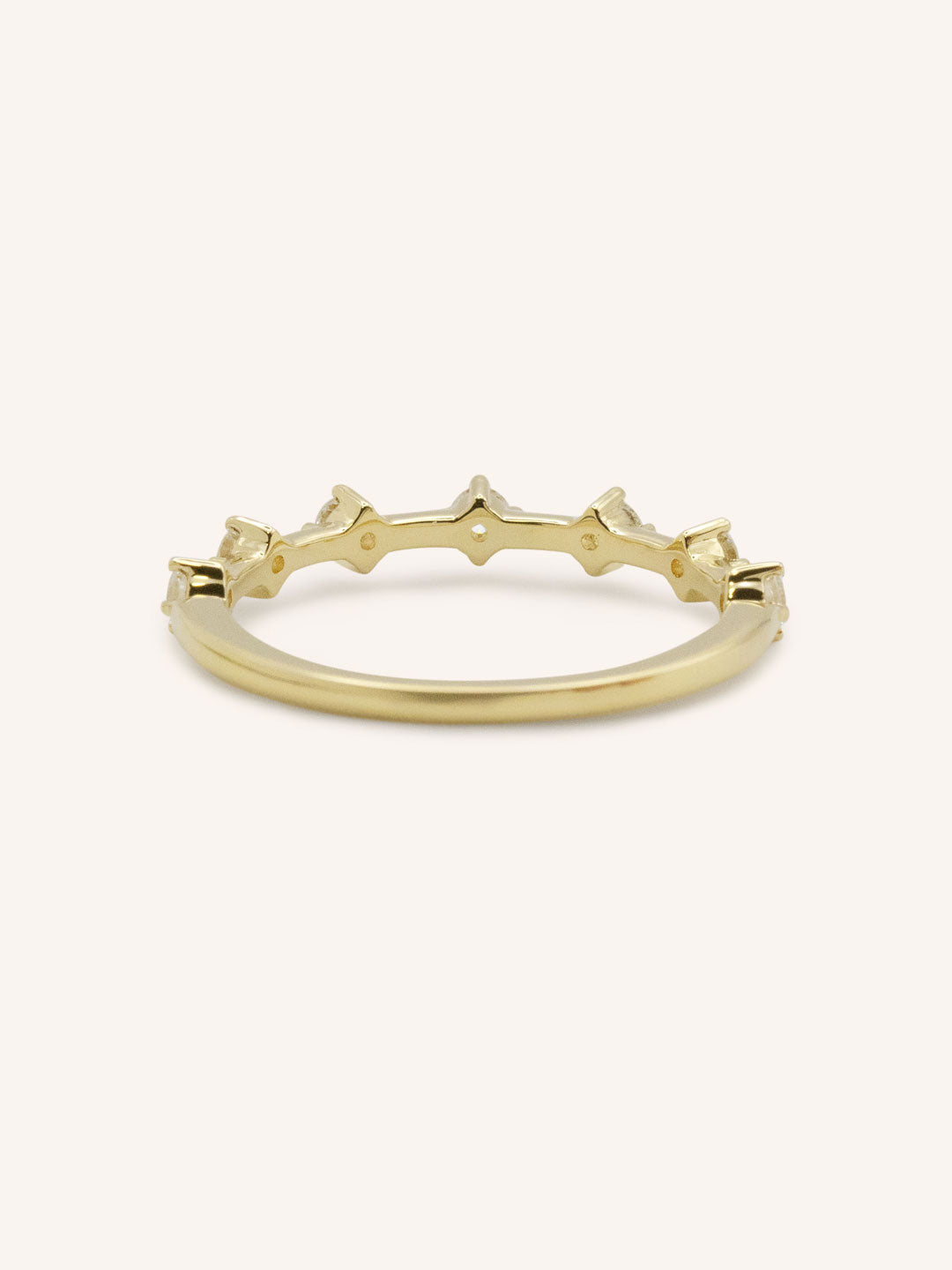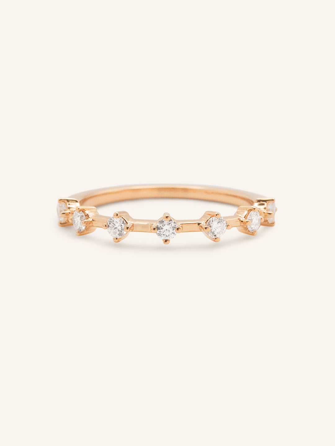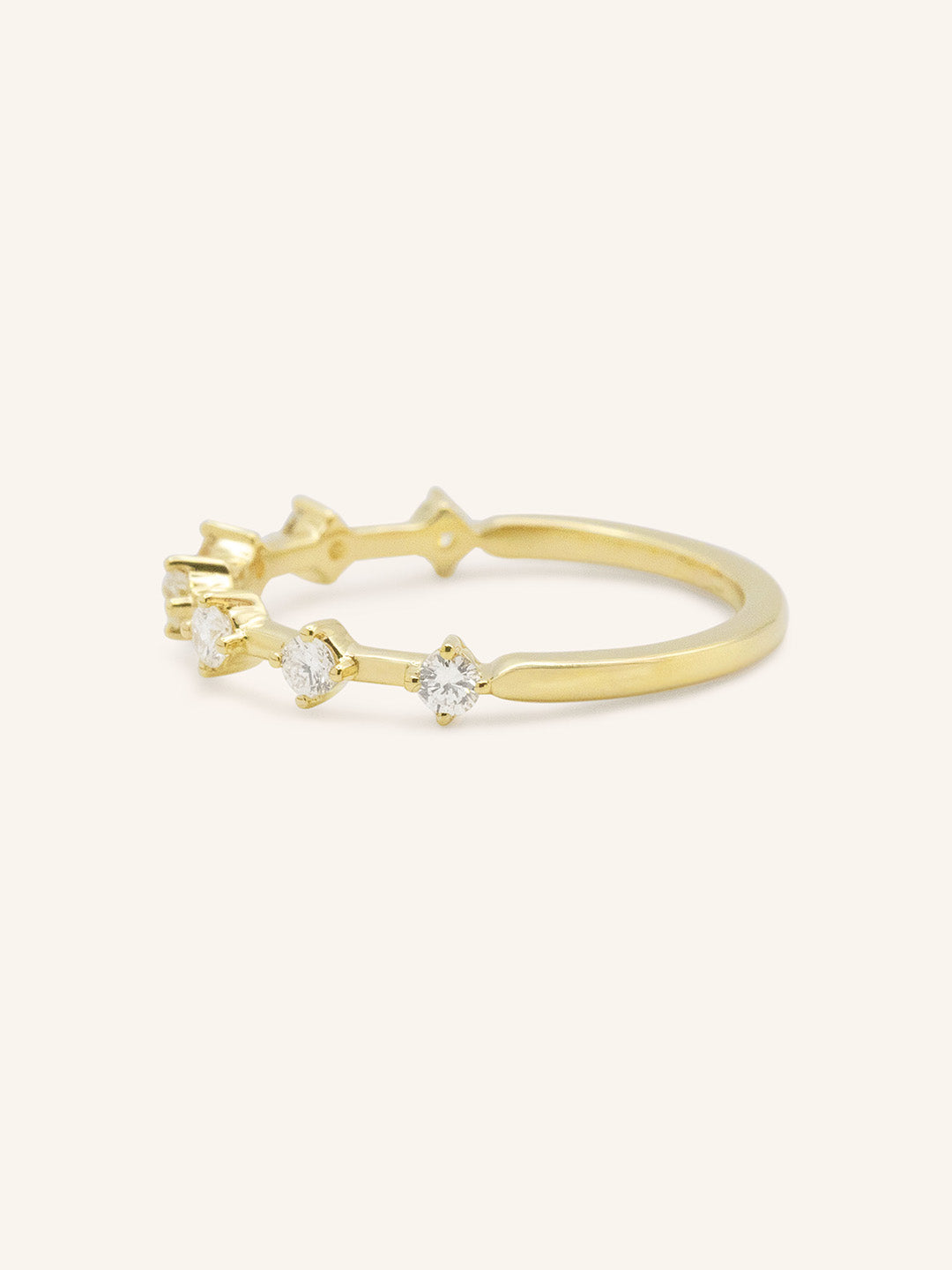 The Arianna Diamond Wedding Band offers a refined, minimalist elegance. Set with round diamonds spaced evenly along the band, this design creates a delicate rhythm of sparkle and gold. Whether worn as a wedding band, a stacking piece, or a stand-alone statement, Arianna adds a graceful touch of brilliance with its airy, modern look.