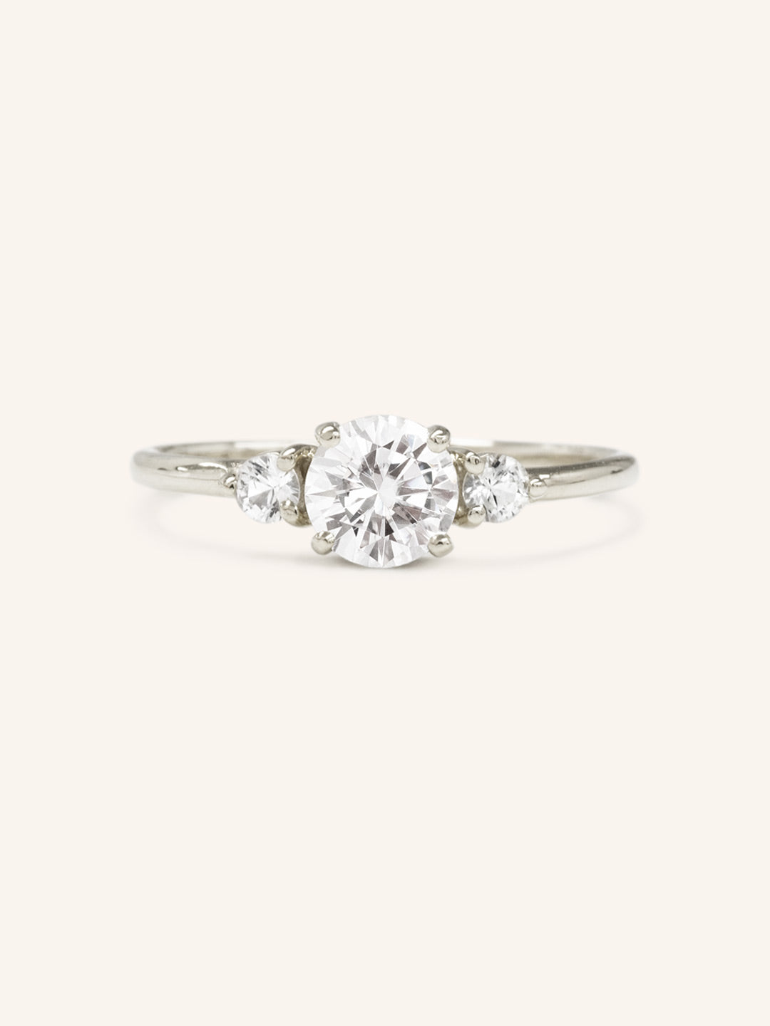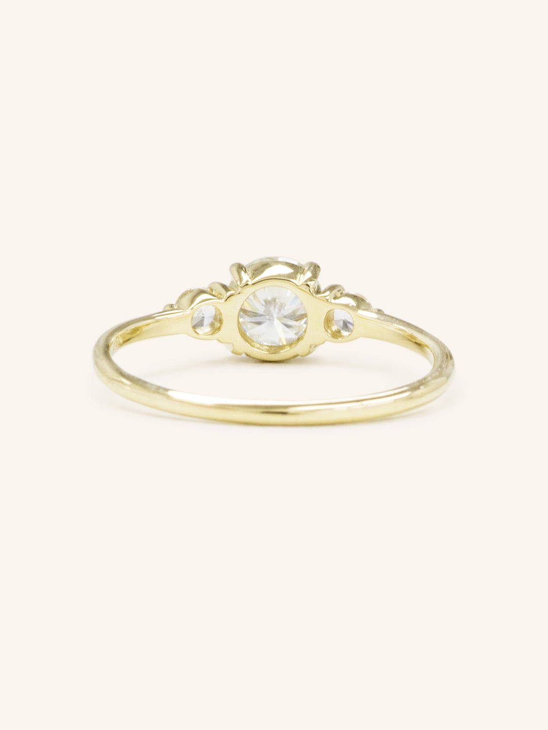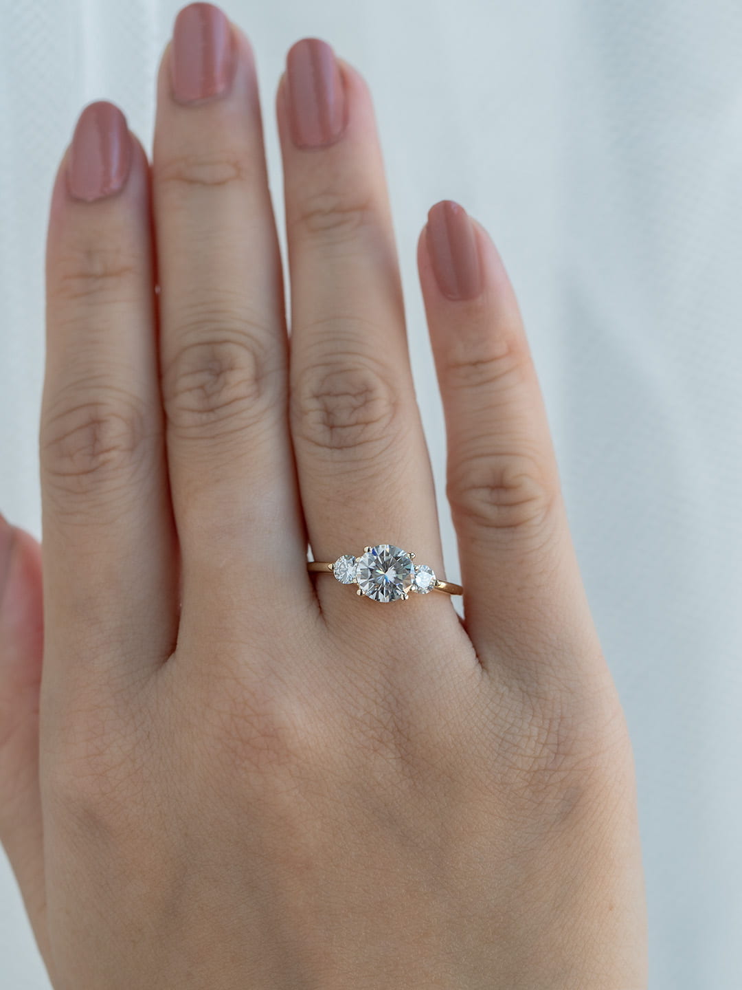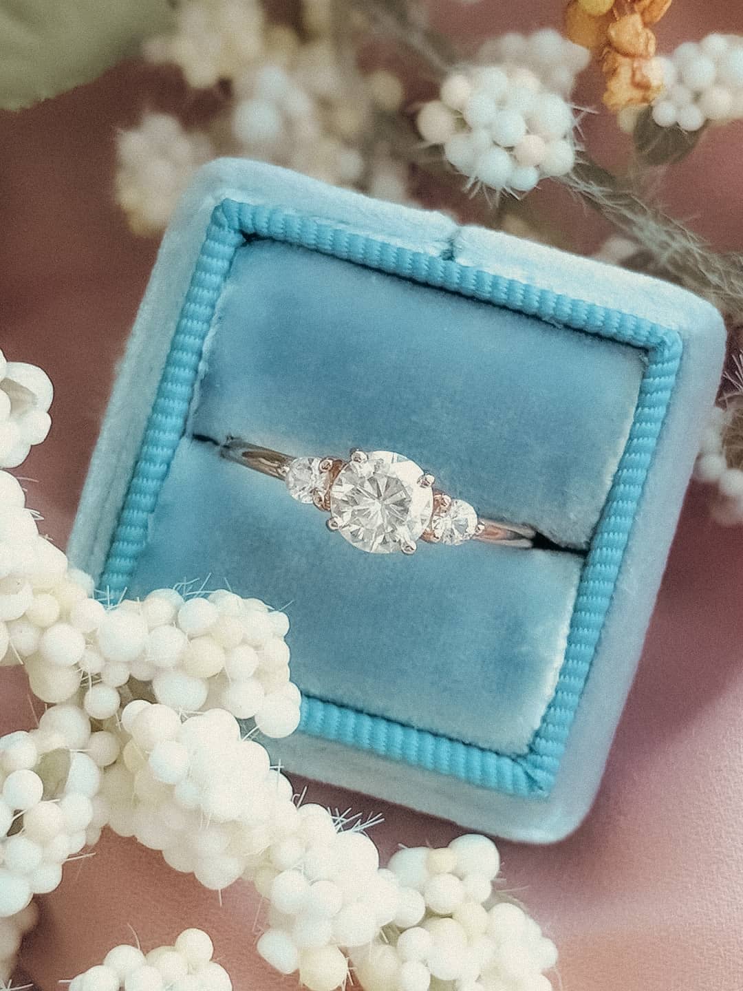 Blushing Bride Round Moissanite Three Stone Engagement Ring