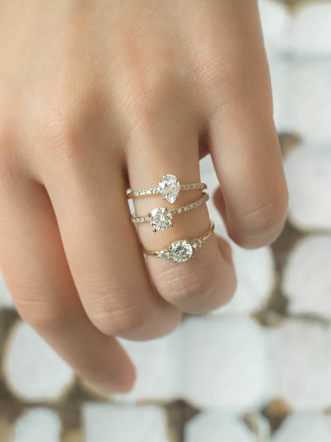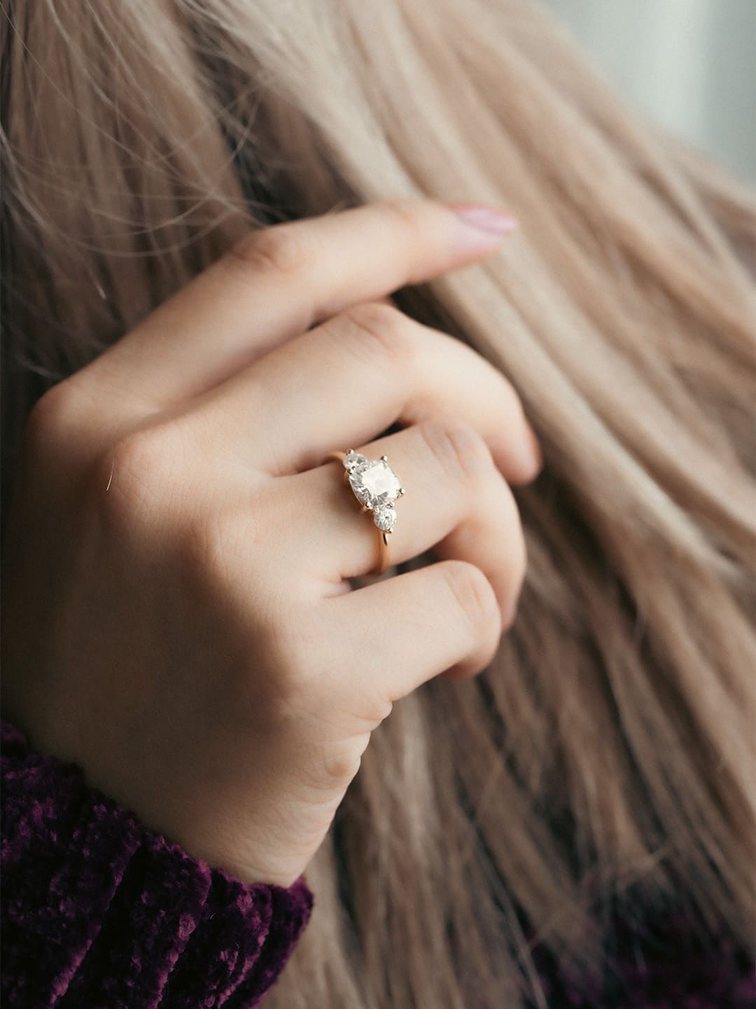 All of our engagement rings feature natural, lab-grown diamonds, and/or moissanites. They are ethically sourced and hand-selected for their quality and brilliance. Each product page specifies the stone type.