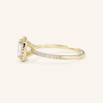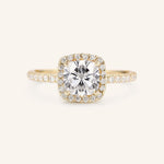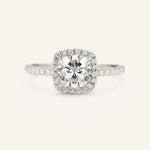 This Brocade Halo Cushion Moissanite Engagement Ring is the epitome of minimalist elegance. A cushion-shaped moissanite is surrounded by a halo of shimmering diamonds, making it a timeless choice for your special day. Crafted with sophistication and refinement, this exclusive design ensures you stand out with ineffable style.