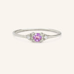 Petite, yet robustly sparkling, this ring features an amethyst center stone. A modern take on a classic three stone ring, this piece is timeless in its design but only made better with a beautiful accent diamond on each side. Beautiful enough to be worn solo as a subtle accent or stacked with other rings.